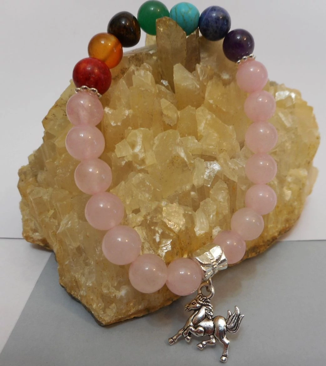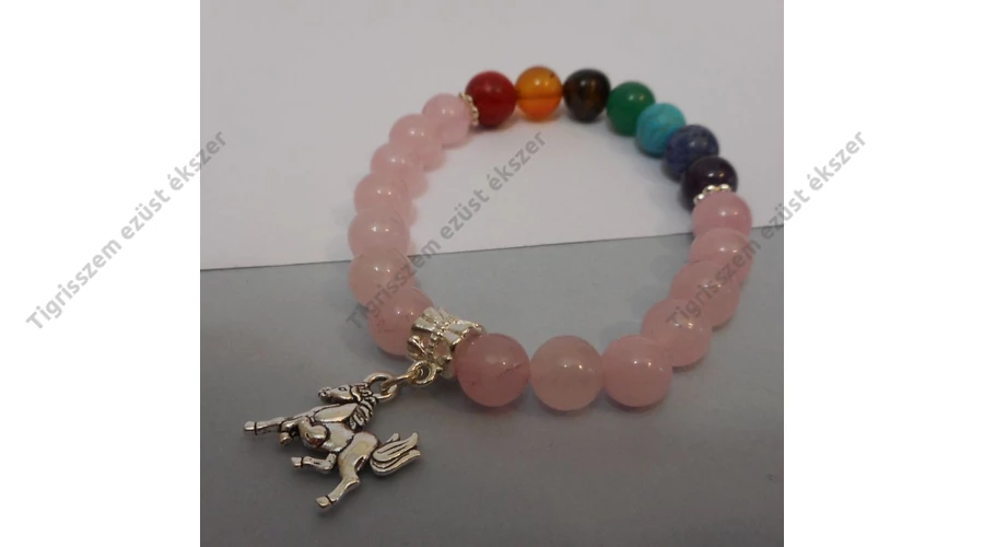 Gyönyörűen,csiszolt "7 csakra" ásvány karkötő 8mm-es kerek szemek,gumis damilra fűzve. Fém köztesekkel díszítve + ló charm. Mind a 7 csakrához 1-1 ásvány tartozik+ 14 szem rózsakvarc,ami a szív csakrához tartozik, így ezt a csakrát még jobban erősíti. A 7 -féle ásvány korall,karneol,tigrisszem,aventurin,türkiz,szodalit,ametiszt |
