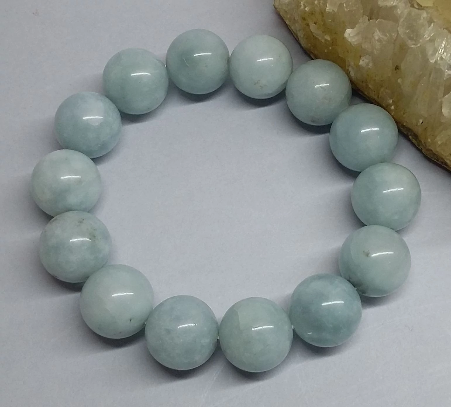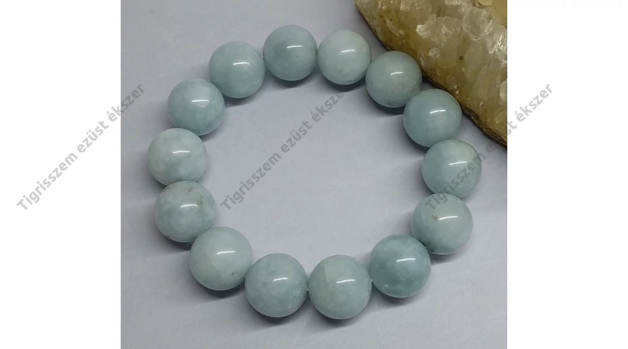 AKVAMARIN karkötő különleges,egyedi csiszolású, 24 mm-es nagy méretű kerek szemekből fűzve. 14 szemből,dupla ,rugalmas damilra van fűzve.Hossza:19-20 cm Drágakő minőség! ANGYALI kő és a SPIRITUALITÁS köve! A BOLDOGSÁG, REMÉNY és HOSSZÚ FIATALSÁG köve! Az AKVAMARIN egy legenda szerint a hableányok tengerfenéken őrzött ládáikból származik, ezért lett a tengerészek és a tengeren utazók szerencse köve.Az ősi időkben azt tartották róla, hogy szembeszáll a sötétség erőivel! A hajósok talizmánként hordták magukkal vízbe fulladás ellen.Az akvamarin élesebbé teszi a megérzést.Csodálatos kő a meditáláshoz, spirituális tudat eléréséhez.Védi az aurát és összehangolja a csakrákat, megtisztítja a torokcsakrát, összehangolja a fizikai és a spirituális testet. Magasabb rendű dimenziókból hoz üzenetet.