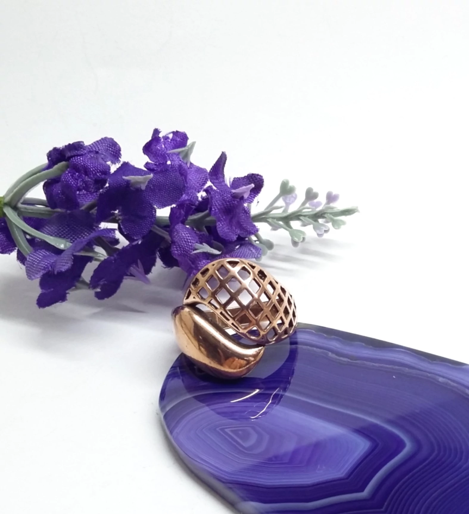 Nagyon különleges ezüst gyűrű a felületén ROSE GOLD(rózsa arany ) bevonattal.Áttört minta,minőségi kidolgozás. 925-ös sterling ezüst Magyar fémjel.54-es méret Megfelelő használat mellett tartós az aranyozás.Kerülni kell a vegyszerek,gyógyfürdők használatát az ékszer viselésekor. |