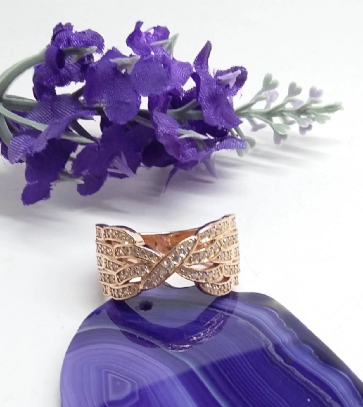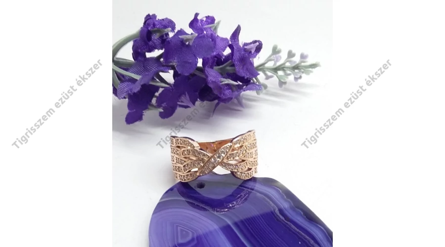 Nagyon különleges ezüst gyűrű a felületén ROSE GOLD(rózsa arany ) bevonattal.Több sorban fehér cirkónia kövekkel,minőségi kidolgozás. 925-ös sterling ezüst Magyar fémjel.55-ös méret Megfelelő használat mellett tartós az aranyozás.Kerülni kell a vegyszerek,gyógyfürdők használatát az ékszer viselésekor. |