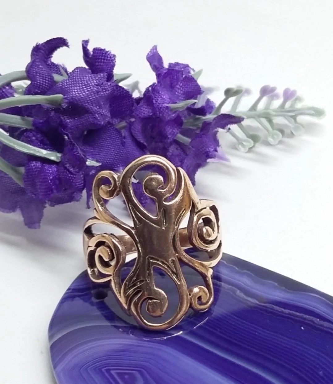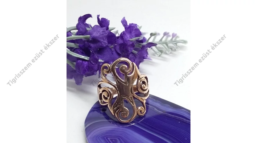 Nagyon különleges ezüst gyűrű a felületén ROSE GOLD(rózsa arany ) bevonattal.Áttört minta,minőségi kidolgozás. 925-ös sterling ezüst Magyar fémjel.56-os méret Megfelelő használat mellett tartós az aranyozás.Kerülni kell a vegyszerek,gyógyfürdők használatát az ékszer viselésekor. |