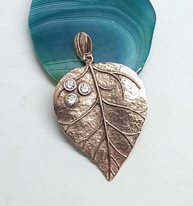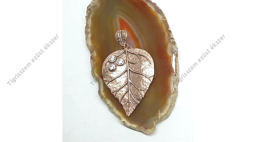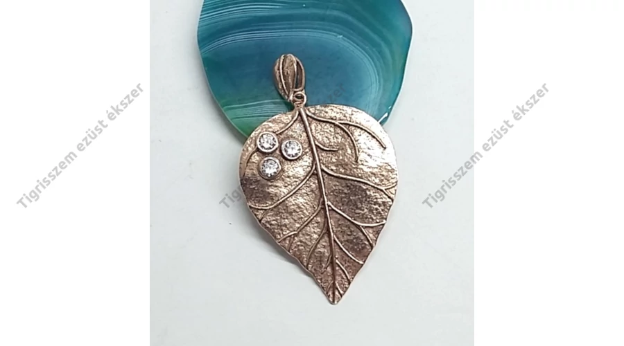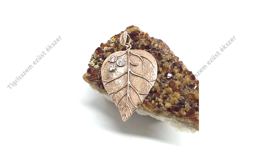 Nagyon különleges ezüst levél medál a felületén ROSE GOLD(rózsa arany ) bevonattal + 3db cirkónia kővel.Minőségi kidolgozás. 925-ös sterling ezüst Magyar fémjel. Megfelelő használat mellett tartós az aranyozás.Kerülni kell a vegyszerek,gyógyfürdők használatát az ékszer viselésekor. |