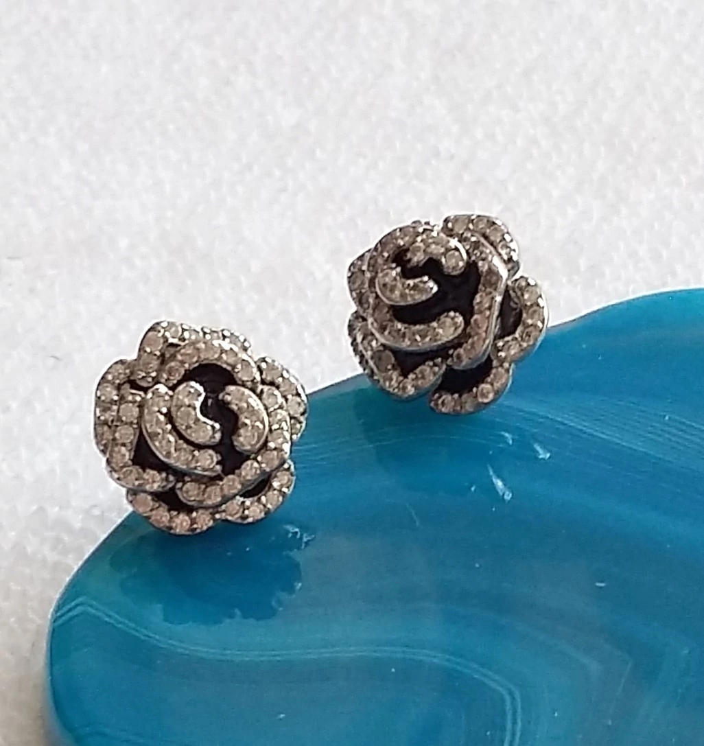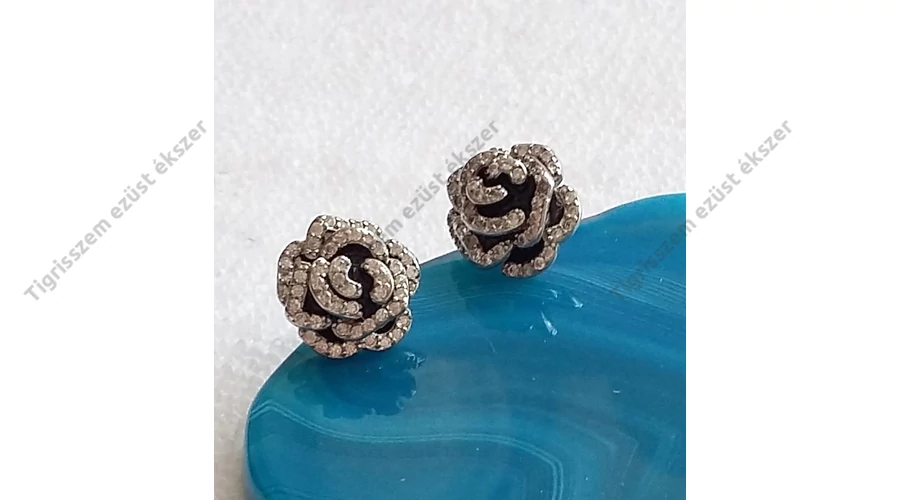 Ezüst rózsa fülbevaló fehér cirkónia kövekkel,stekkeres. Különleges dekoratív fazon,minden korosztálynak. Minőségi kidolgozás. Magyar fémjel.925-ös sterling ezüst.