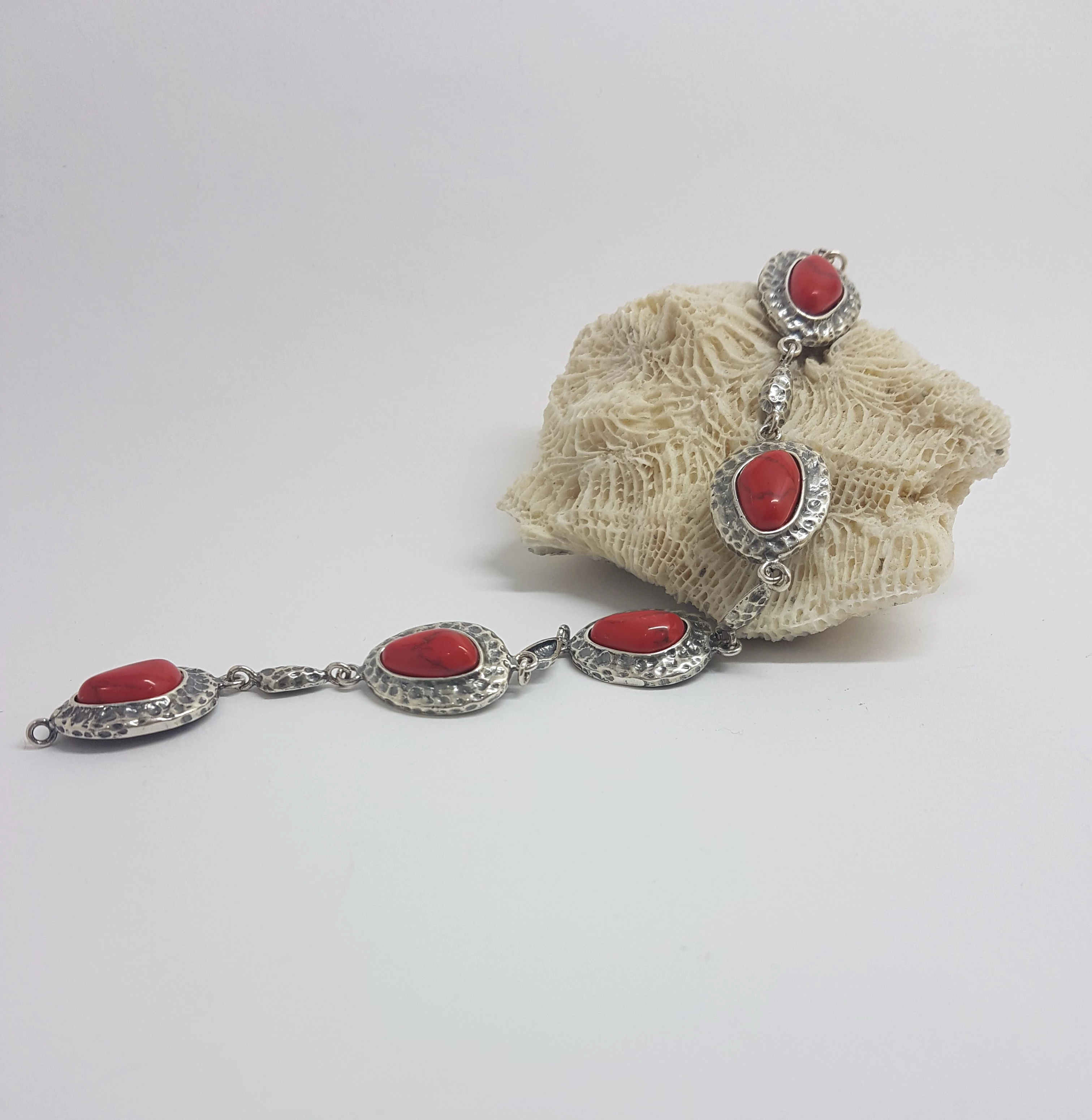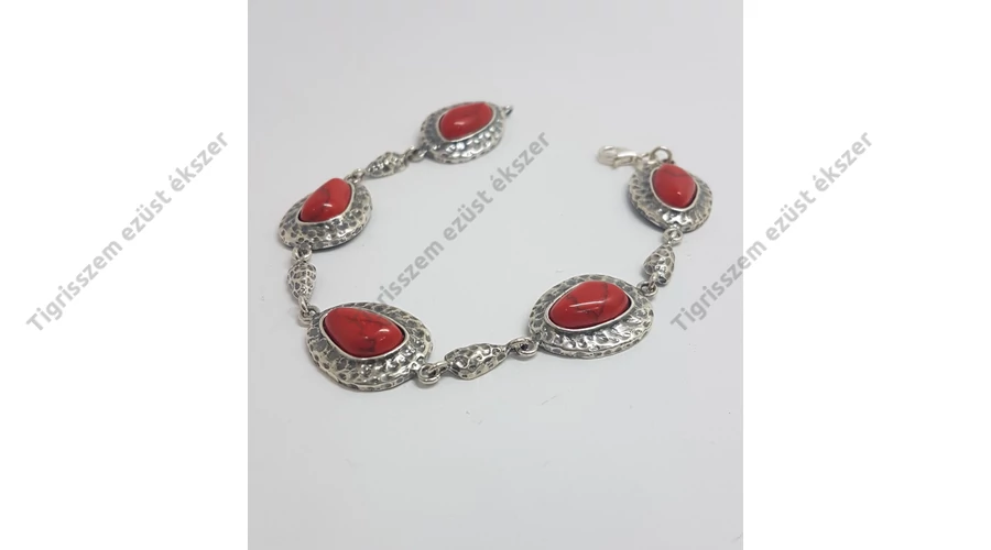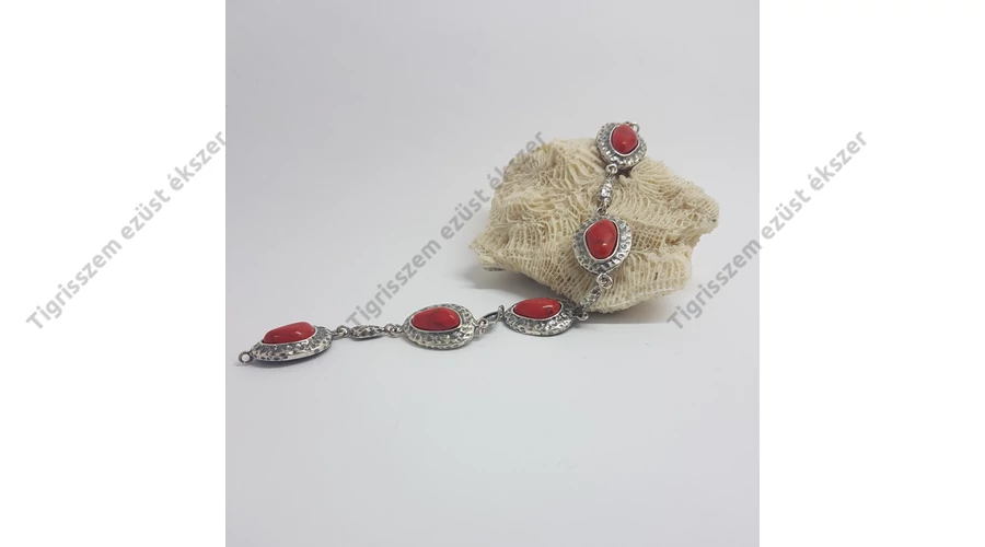 Gyönyörűen kidolgozott,antikolt ezüst karkötő korall kővel.Kézzel készült.5 db 15 mm x 20 mm szem benne a kő 10 mm x15 mm-es.Hossza 20 cm Minőségi kidolgozás. Magyar fémjel. 925-ös sterling ezüst |