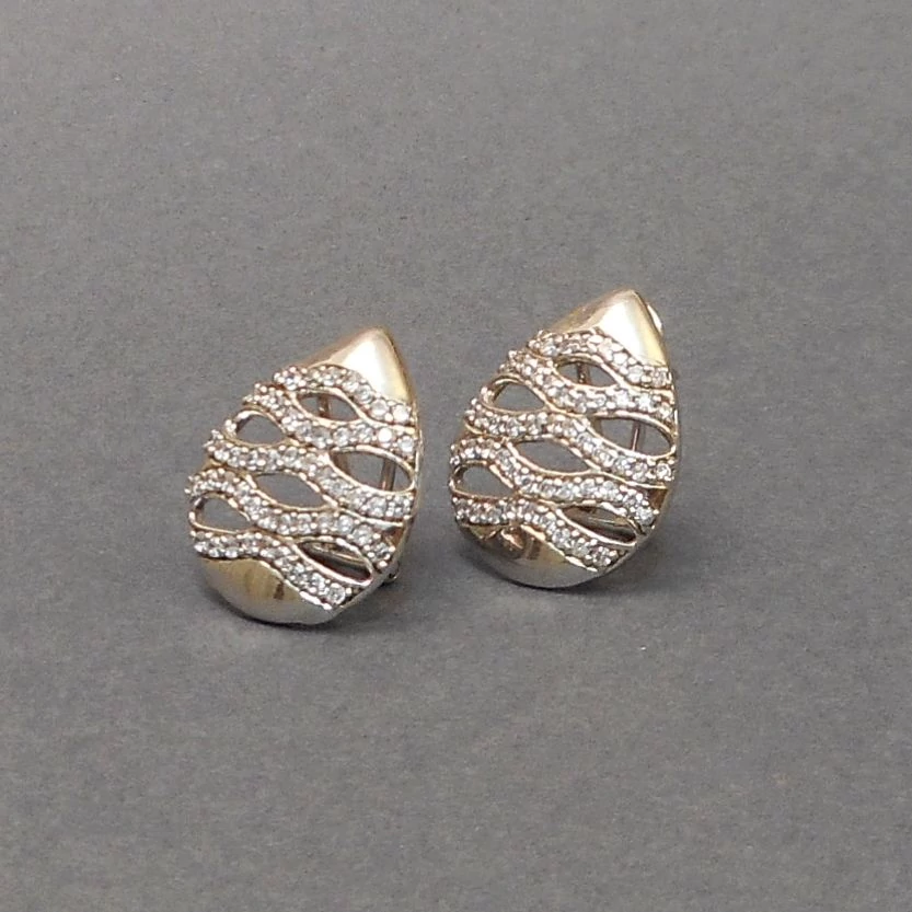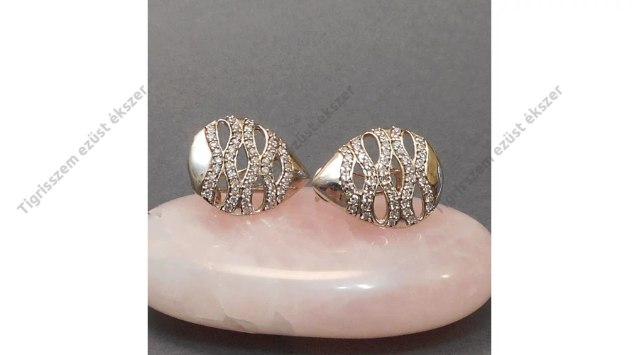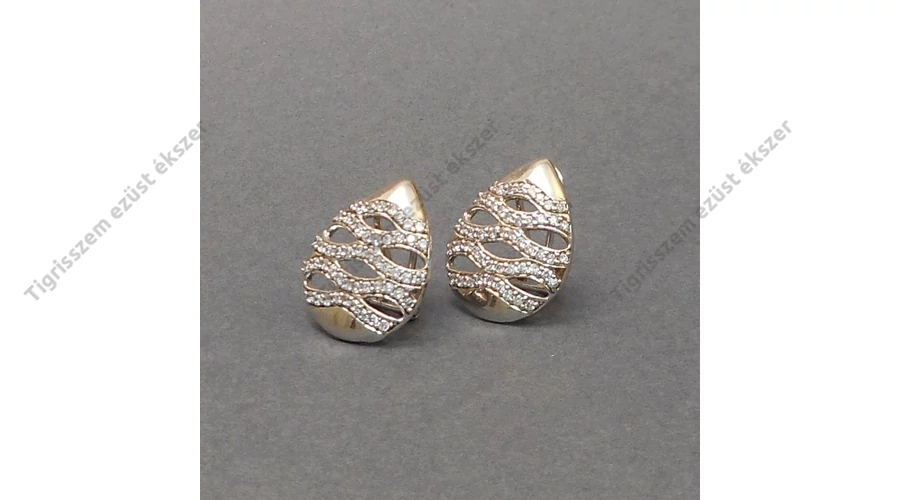 | Gyönyörűen kodolgozott ,különleges ezüst fülbevaló csepp forma áttört és apró fehércirkóniákkal díszített.Ródiumos. | |