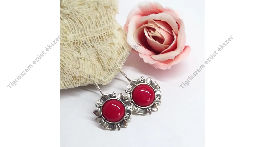 Ezüst fülbevaló korall kővel,virág