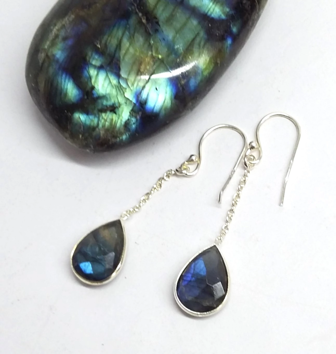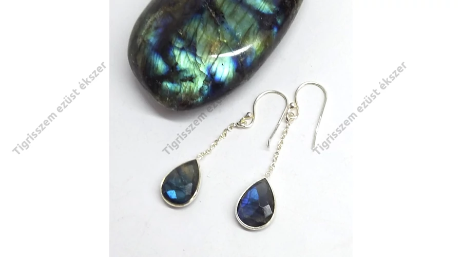 Gyönyörűen kidolgozott ezüst fülbevaló egy csepp alakú fazettára csiszolt labradorittal.Láncos. Beakasztós,csüngős. Egyedi,különleges fazon! 925-ös sterling ezüst,magyar fémjel |