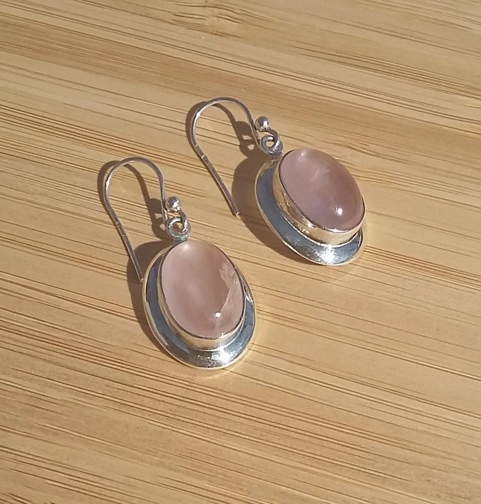 Különleges,egyedi,kézzel készült ezüst csüngős fülbevaló,ovális forma,kaboson csiszolású VALÓDI RÓZSAKVARC kővel. Minőségi kidolgozás. 925-ös finomság. Magyar fémjellel ellátva.