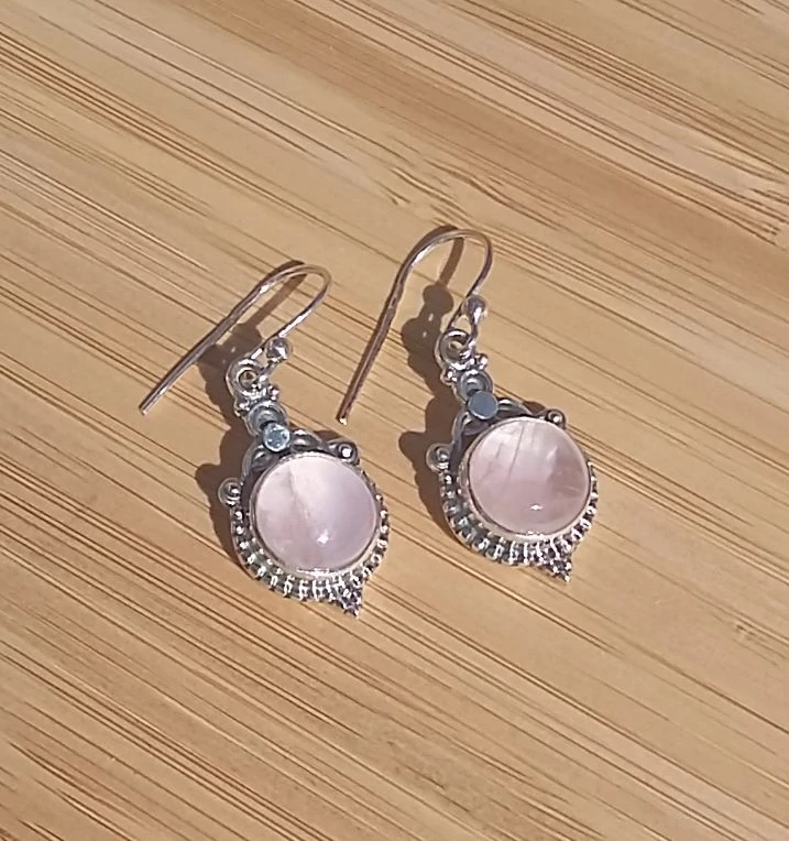 Különleges,egyedi,kézzel készült ezüst csüngős fülbevaló,kerek forma,kaboson csiszolású VALÓDI RÓZSAKVARC kővel. Antikolt.Minőségi kidolgozás. 925-ös finomság. Magyar fémjellel ellátva.