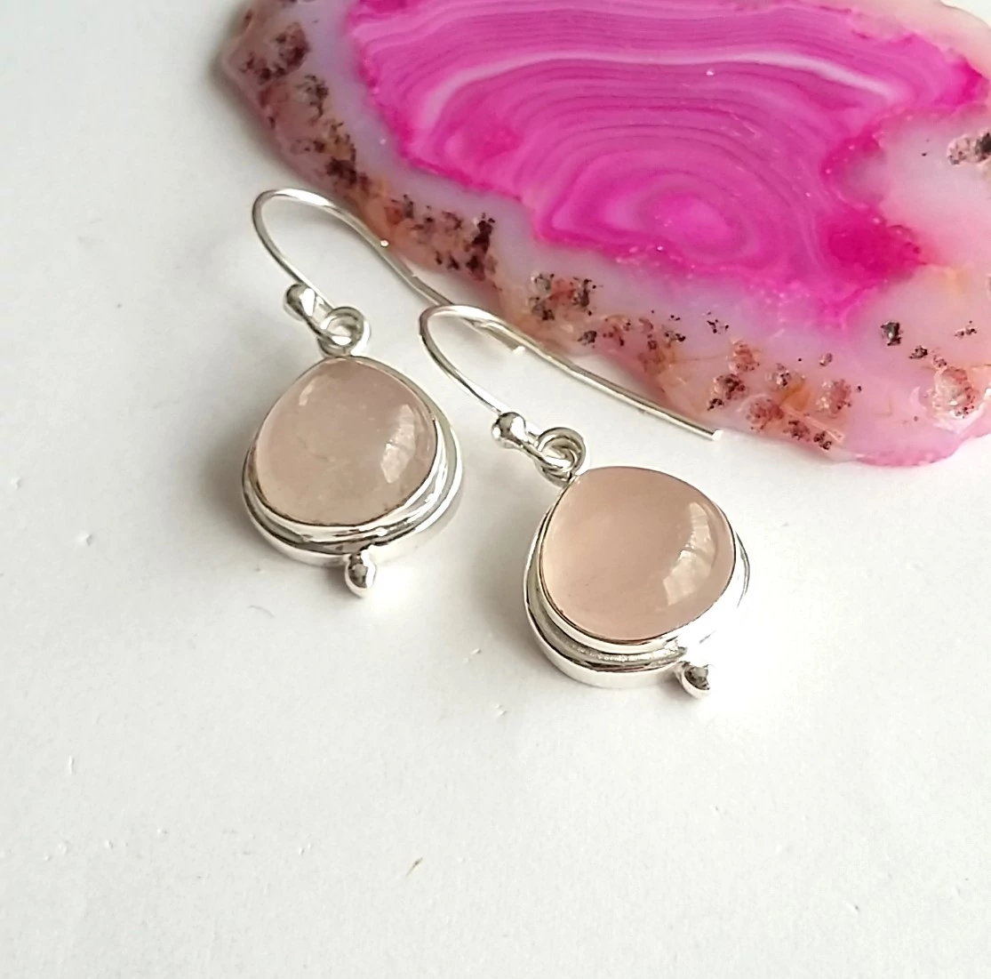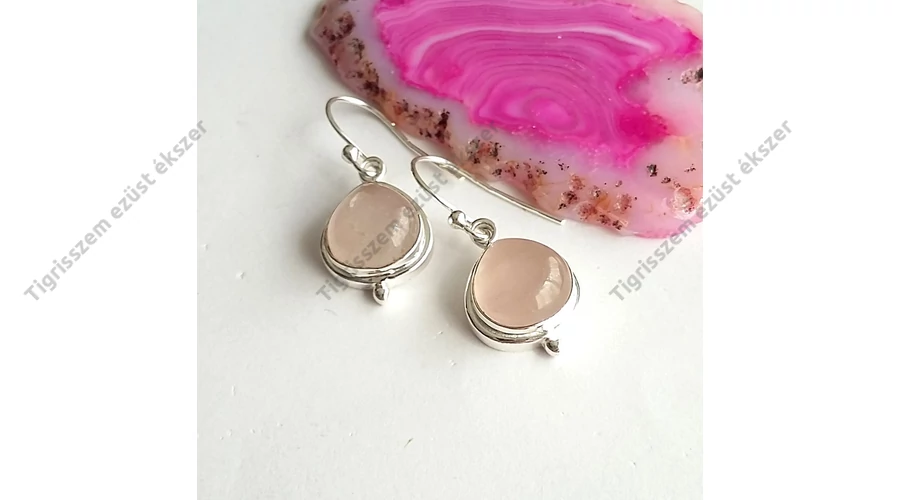 Gyönyörű ezüst fülbevaló,valódi,kaboson csiszolású,csepp forma rózsakvarc kővel. Beakasztós,csüngős fazon. Minőségi kidolgozás.Magyar fémjel.925-ös sterling ezüst. Kérésre kapcsosra átszereljük!