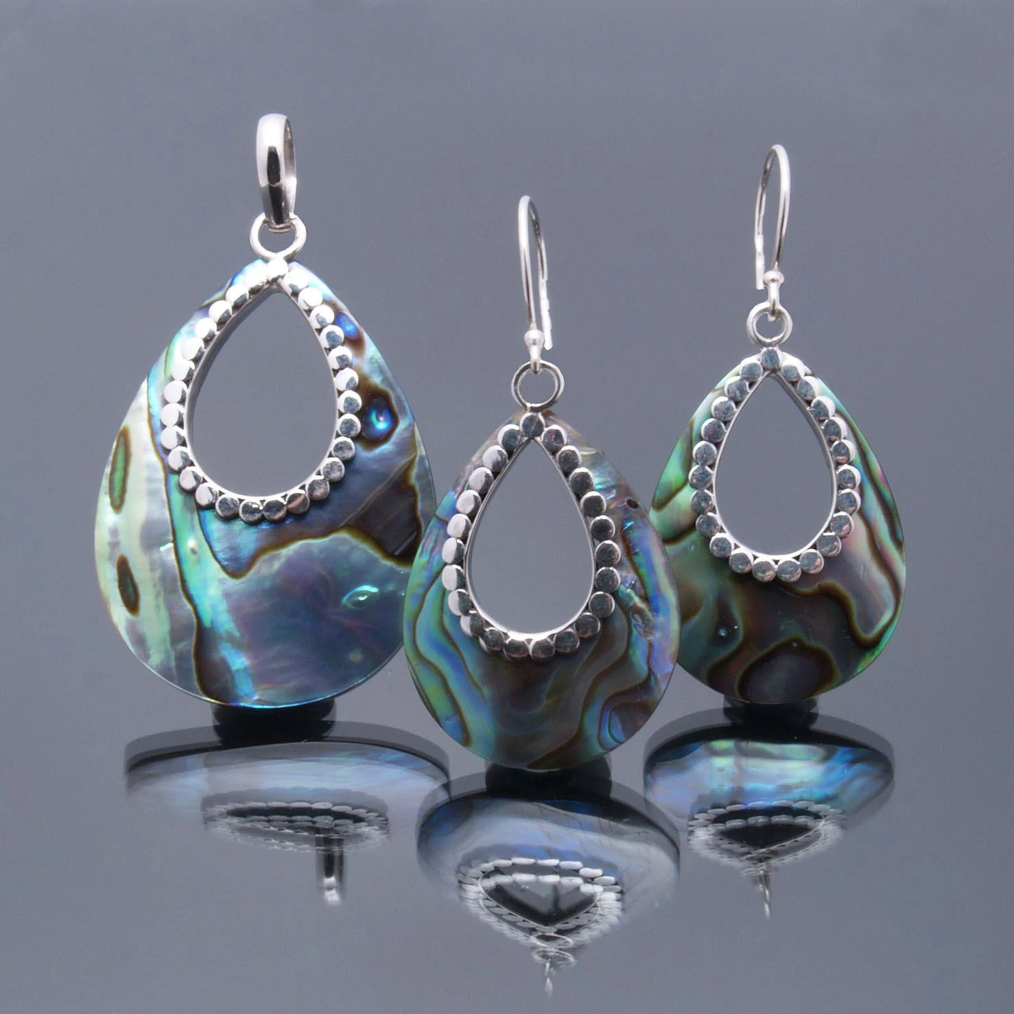 Gyönyörű ezüst szett,PÁVA KAGYLÓVAL.Csüngős,beakasztós csepp forma fülbevaló és medál.Divatos,fiatalos fazon. Minőségi kidolgozás. Magyar fémjel. 925-ös sterling ezüst |