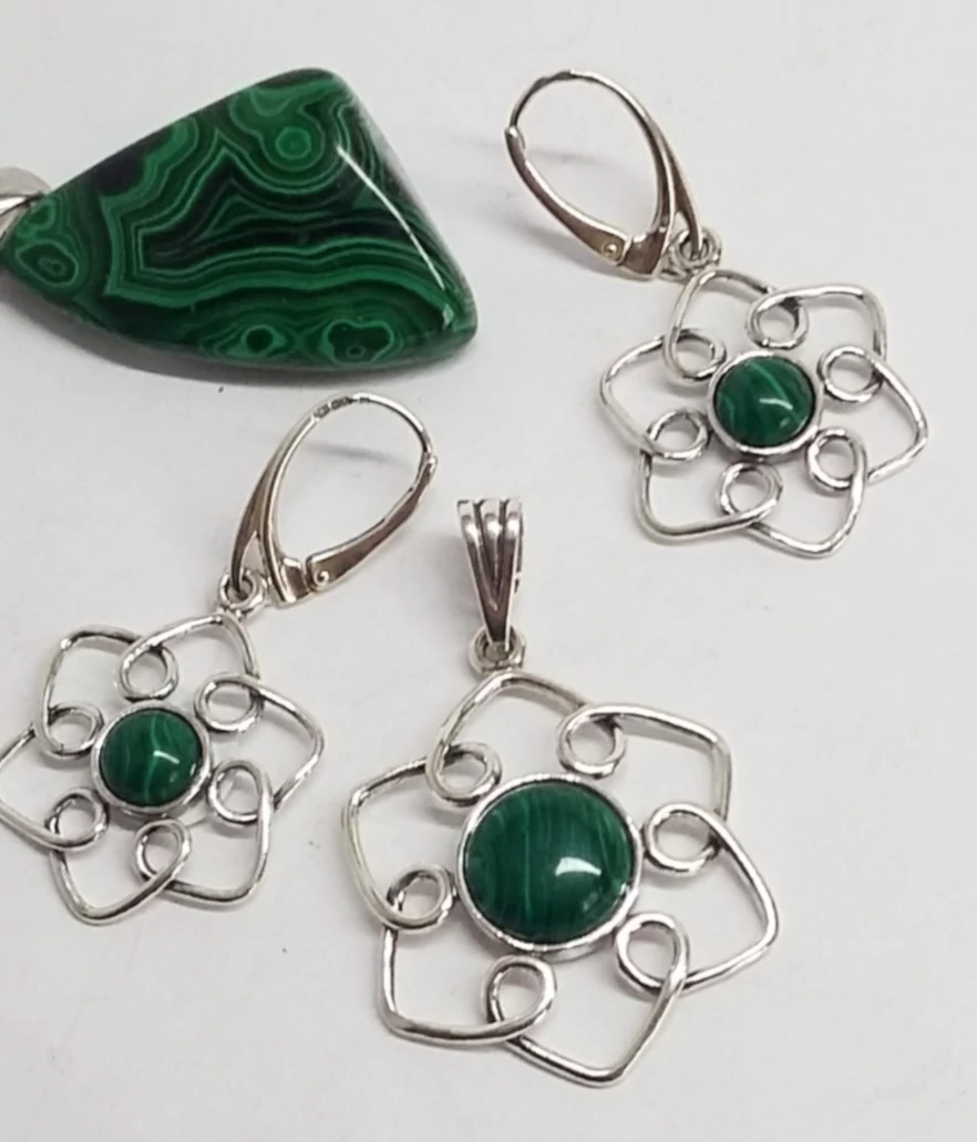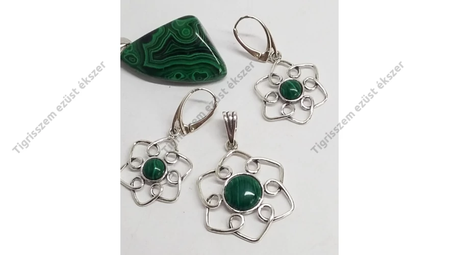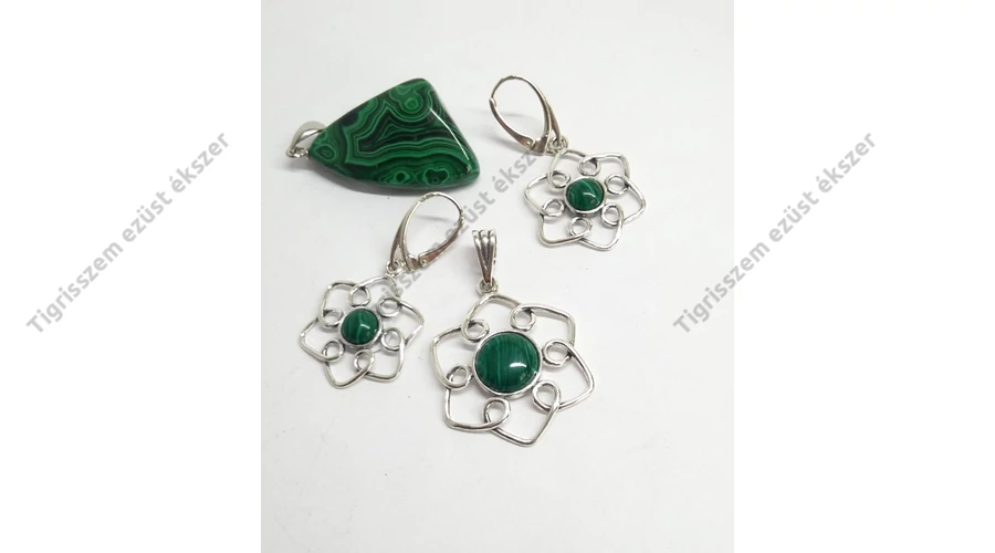 Gyönyörűen kidolgozott ezüst fülbevaló+ medál szett malachit kővel,virág forma. A fülbevaló patent záras,csüngős. Egyedi,különleges fazon! 925-ös sterling ezüst,magyar fémjel |