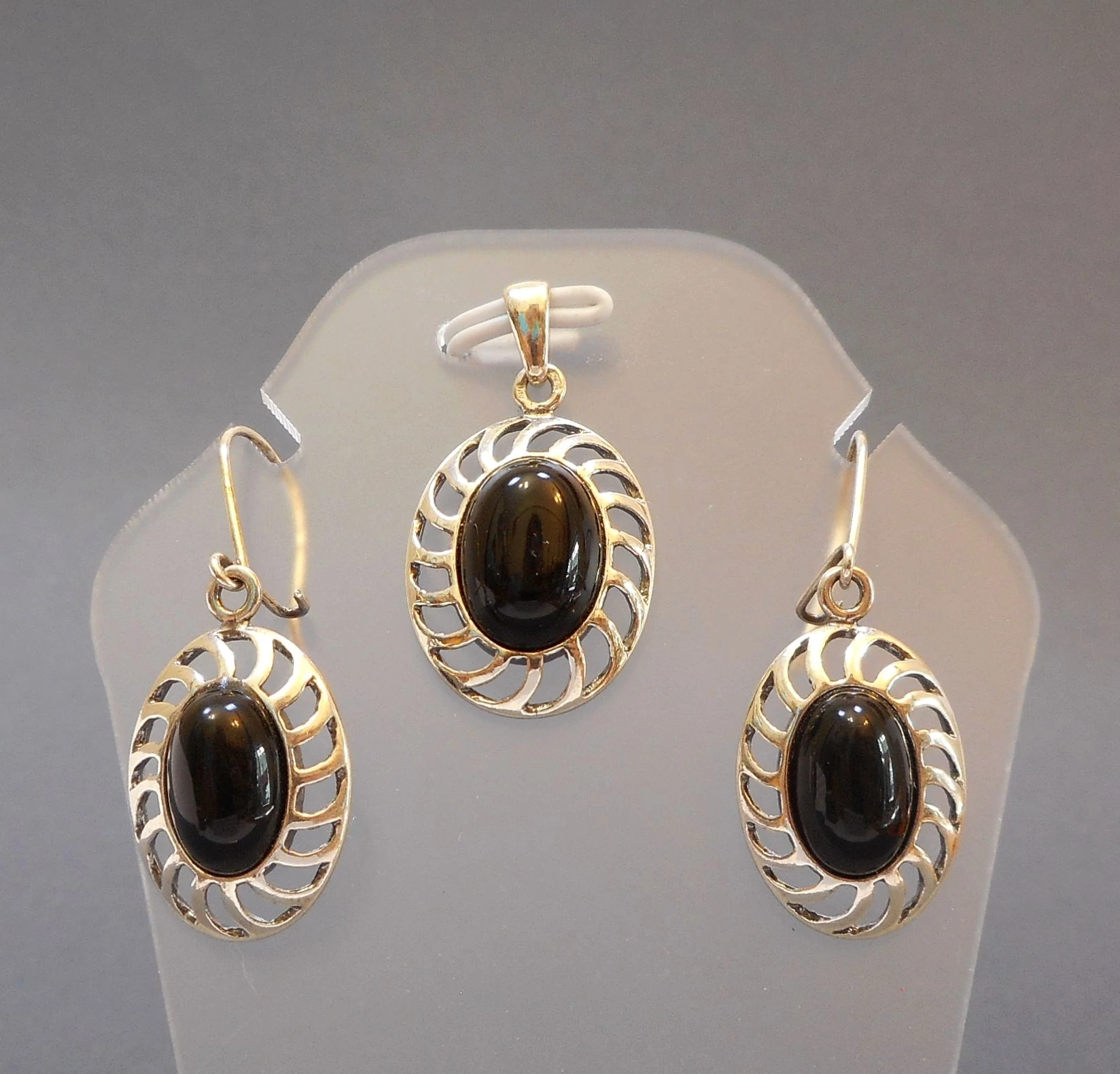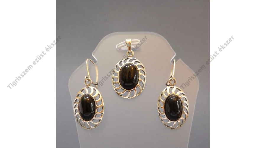 | Gyönyörűen kidolgozott ezüst fülbevaló+medál szett ovális onix kővel. A kő körül áttört ezüst minta,csüngős beakasztós,kapcsos. | |