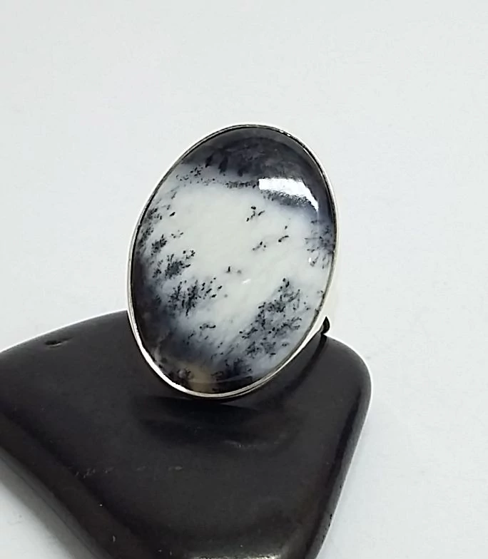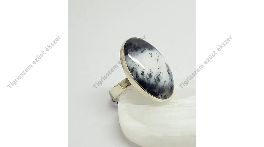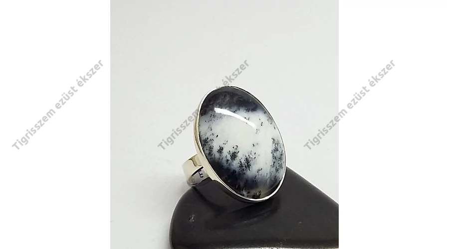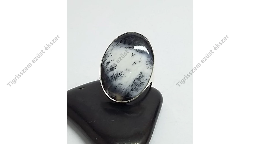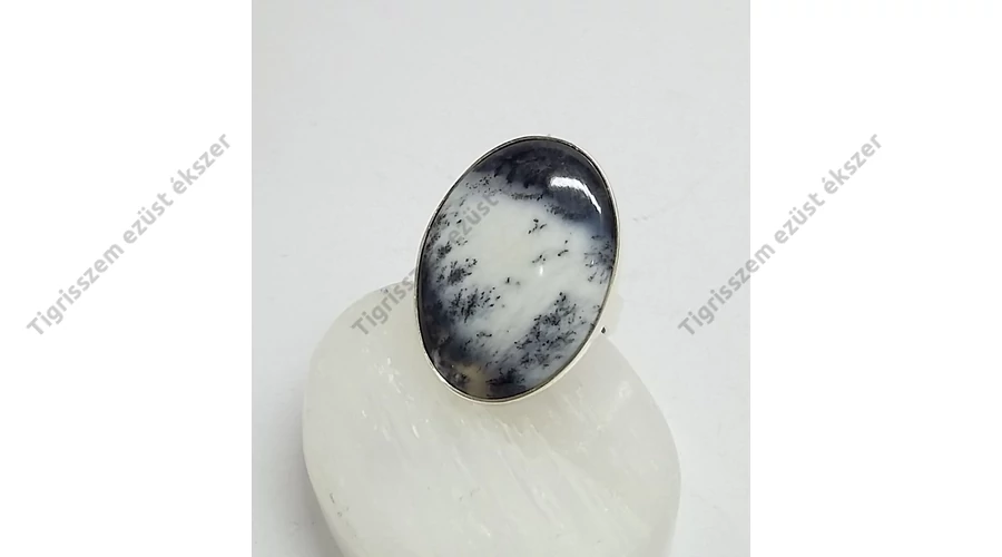 Gyönyörű ezüst gyűrű egy igen ritka és különleges valódi kővel,DENDRITES OPÁL vagy más néven MERLINIT. Nagy méretű ovális forma a kő. 925-ös sterling ezüst,magyar fémjel A MERLINIT ezoterikus név, mely a különleges gyógyhatására utal.Ezzel két fajta ásványt szoktak így nevezni. Ezek a Dendrites Achát és a Dendrites Opál. Az extra minőségű Dendrites Opál fehér alapszínében változó mennyiségű és rajzolatú fekete Mangán rajzolatokat, dendriteket lehet találni.
