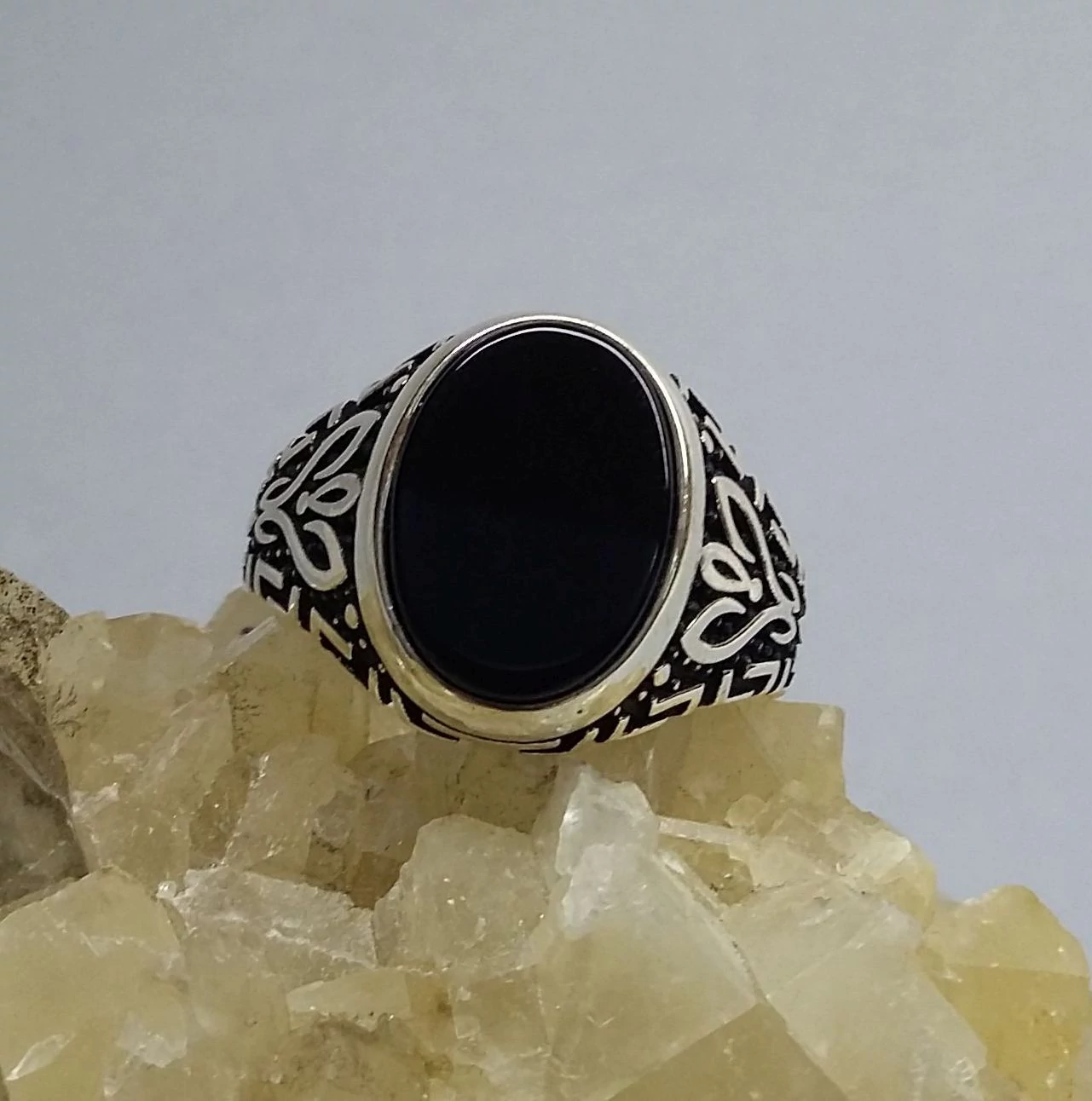 Gyönyörűen kidolgozott ezüst ffi gyűrű,ovális forma onix kővel.Az oldalán nagyon szép domborodó mintával,antikolt. 925-ös sterling ezüst Magyar fémjel. |
