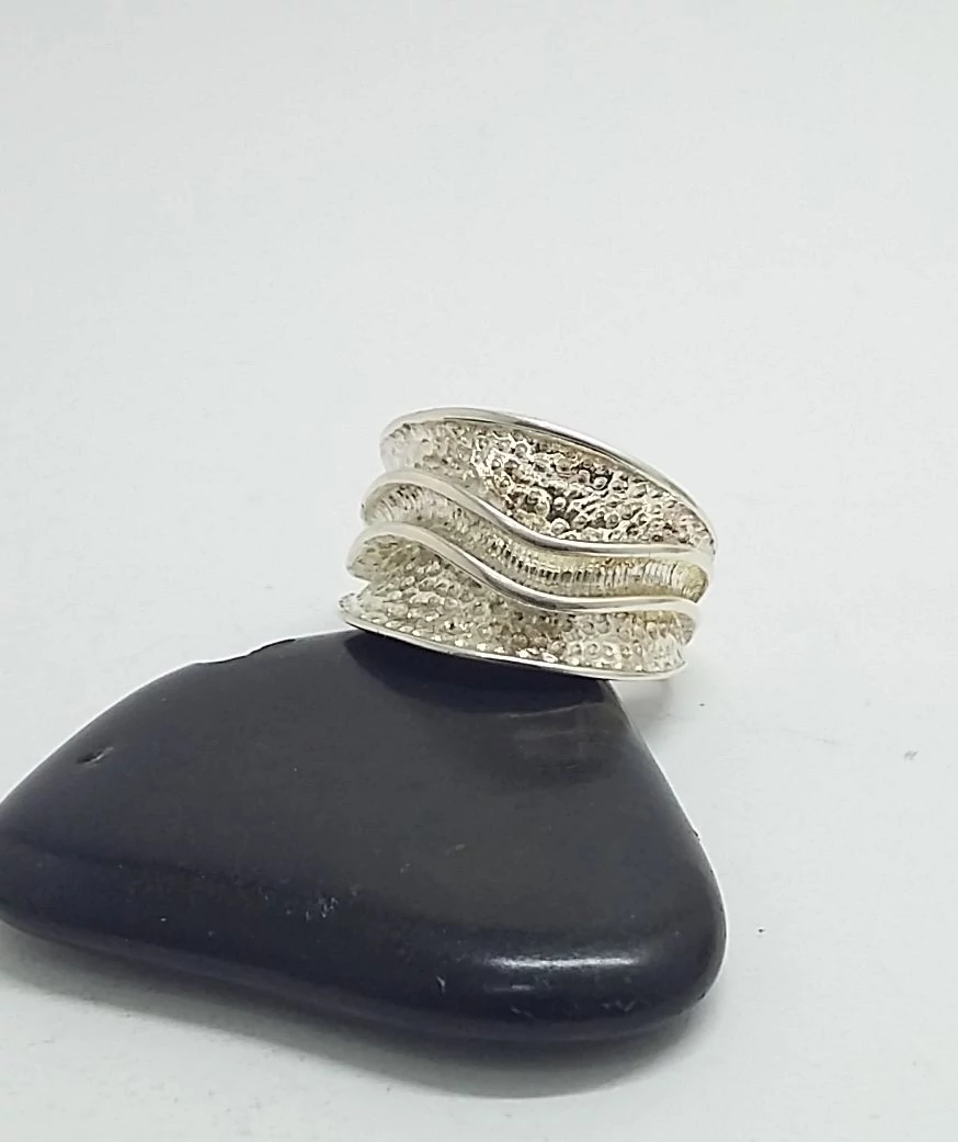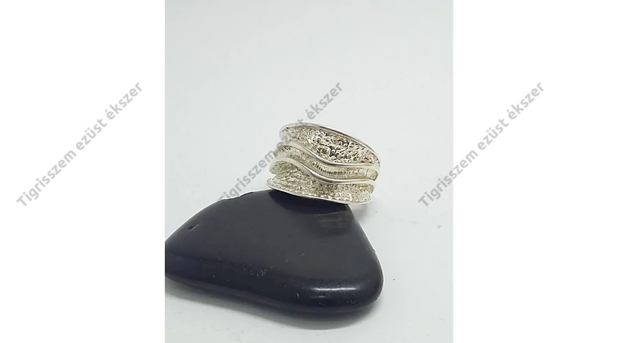 Gyönyörűen kidolgozott kő nélküli ezüst gyűrű,hullám mintás.56-os méret. 925-ös finomság.Minőségi kidolgozás. Magyar fémjellel ellátva.