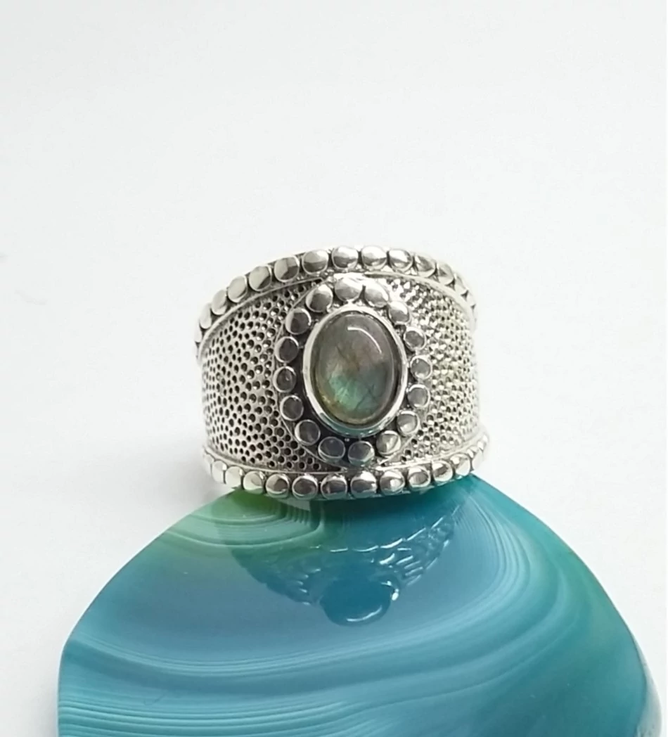 Gyönyörű,különlegesen szép kékes-zöldes fényű LABRADORIT köves ezüst gyűrű. Széles,míves foglalatban 57-es méret 925-ös sterling ezüst, Magyar fémjel |