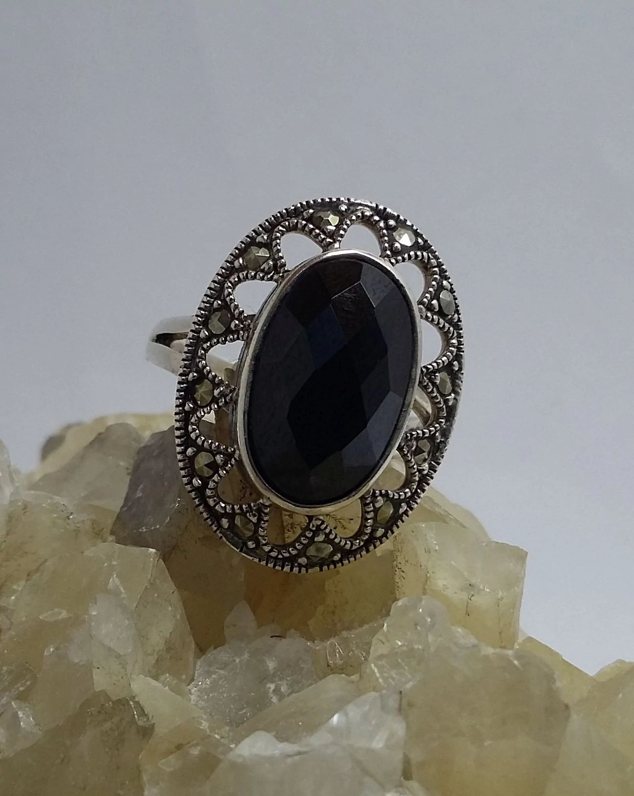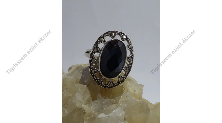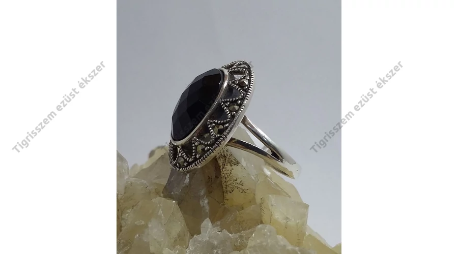 Gyönyörű egyedi fazonú markazit köves ezüst gyűrű középen egy fazettára csiszolt onix kővel. Ovális forma.Antikolt. Magyar fémjellel ellátva,925-ös sterling ezüst Minőségi kidolgozás! |
