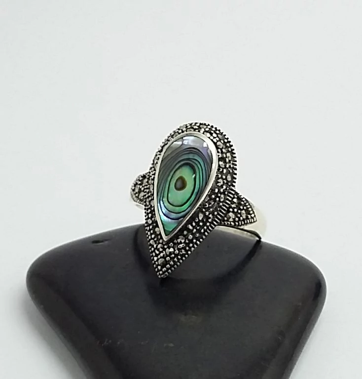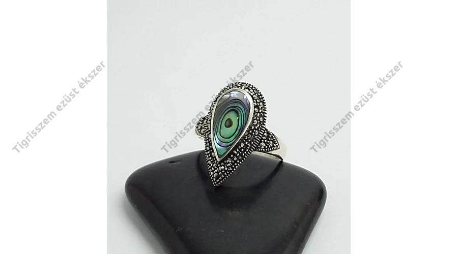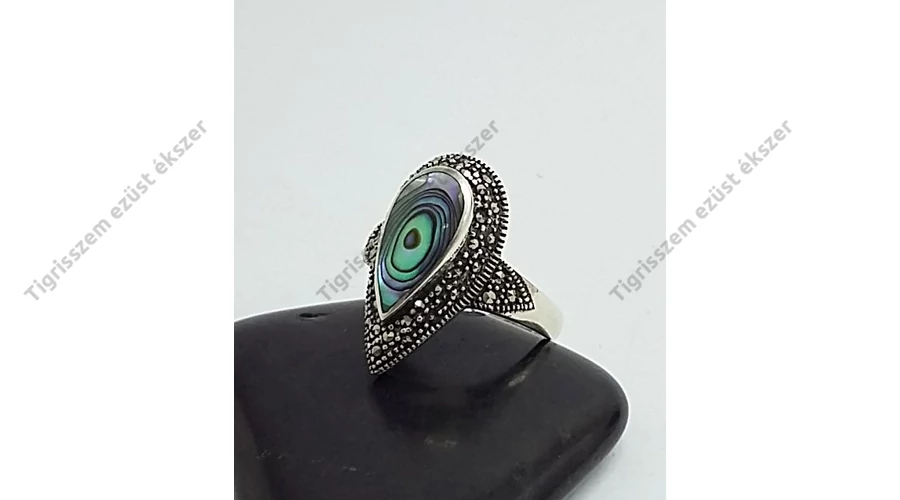 Gyönyörű,különleges ezüst gyűrű csepp forma. Páva kagylóval és markazit kövekkel. 925-ös sterling ezüst,magyar fémjel |