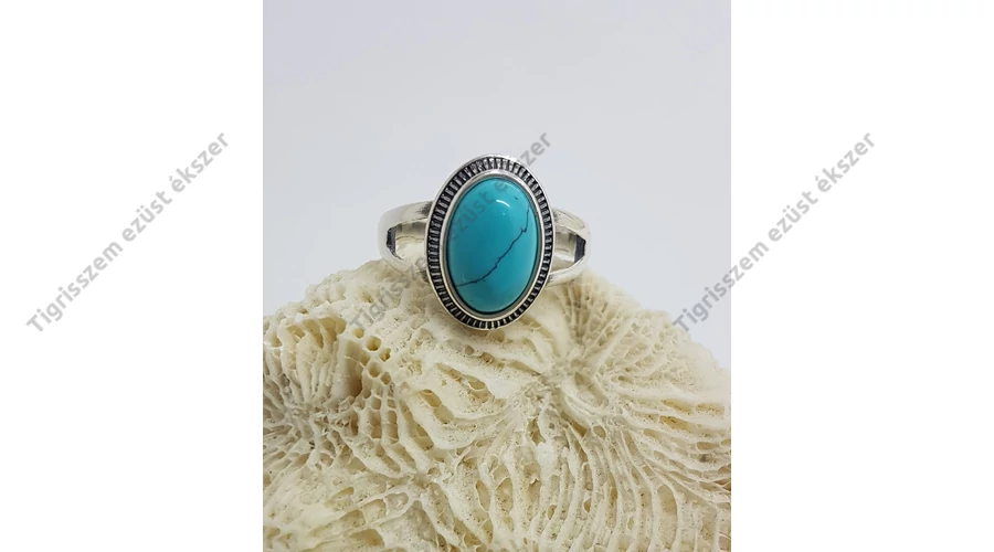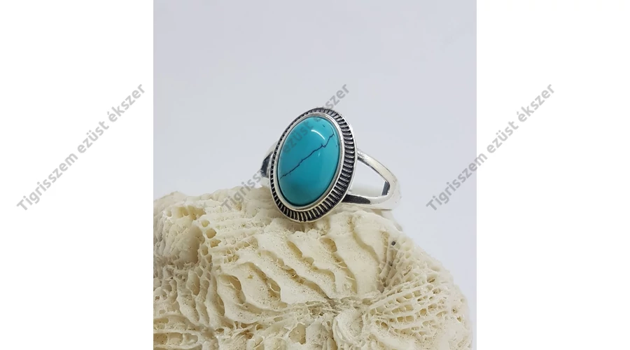 Gyönyörűen kidolgozott ezüst gyűrű,kaboson csiszolású, ovális forma türkiz kővel.Antikolt. Minőségi kidolgozás. Magyar fémjel. 925-ös sterling ezüst |