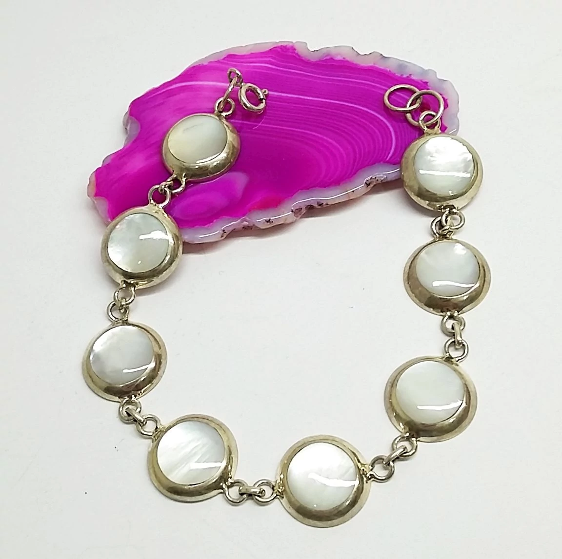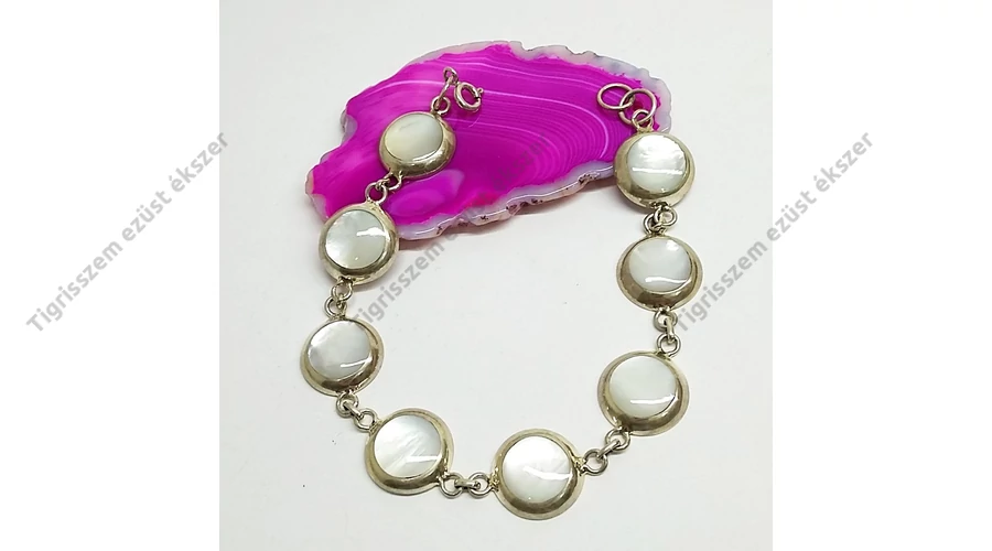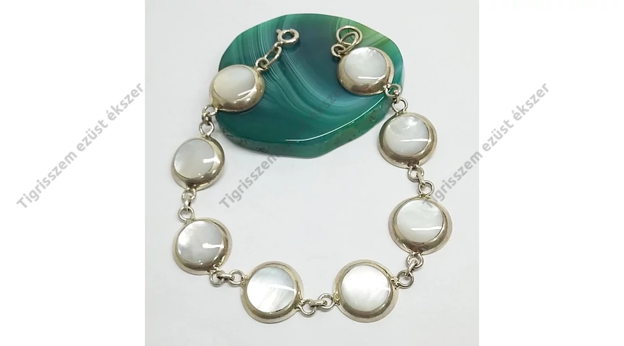 Gyönyörű ezüst karkötő gyöngyházzal.19,5 cm hosszú 7 db 13 mm-es szemből áll. Minőségi kidolgozás. Magyar fémjel.925-ös sterling ezüst.