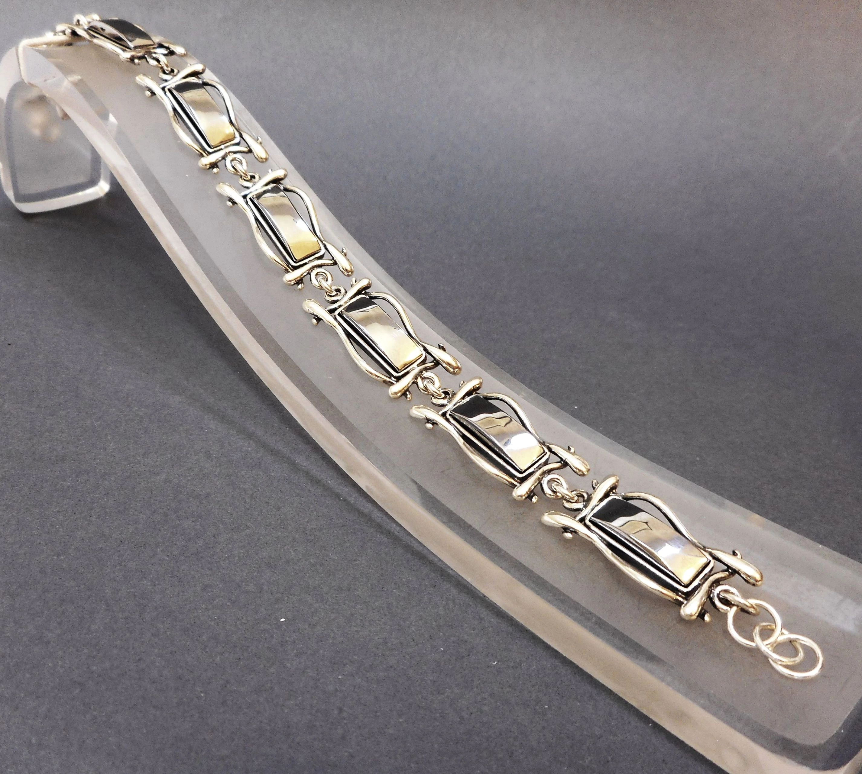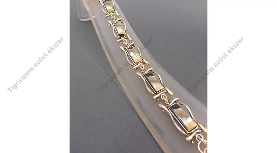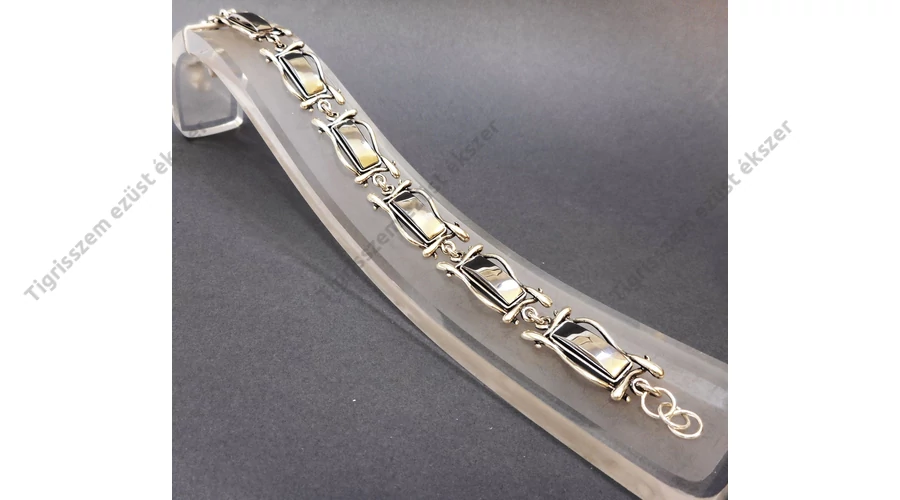 | Gyönyörűen kidolgozott ezüst karkötő hematittal. Szögletes forma. 7 db 12x17 mm-es szem,hossza:20 cm Minőségi kidolgozás. 925-ös finomság. Magyar fémjellel ellátva. | |