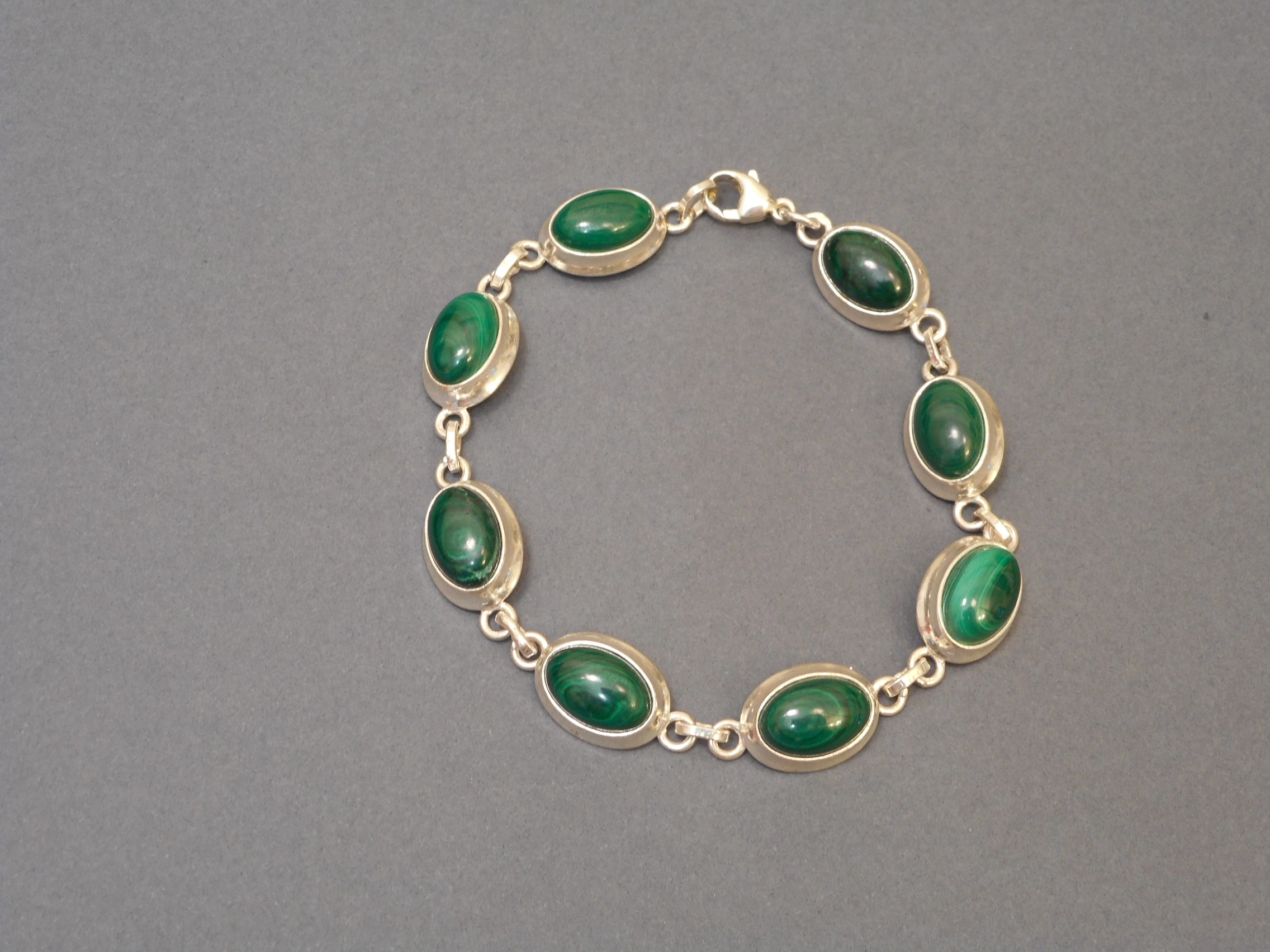 | Gyönyörűen kidolgozott ezüst karkötő malachittal. 8 db 13x11 mm-es ovális szem. Hossza:20 cm Minőségi kidolgozás. 925-ös finomság. Magyar fémjellel ellátva. | |