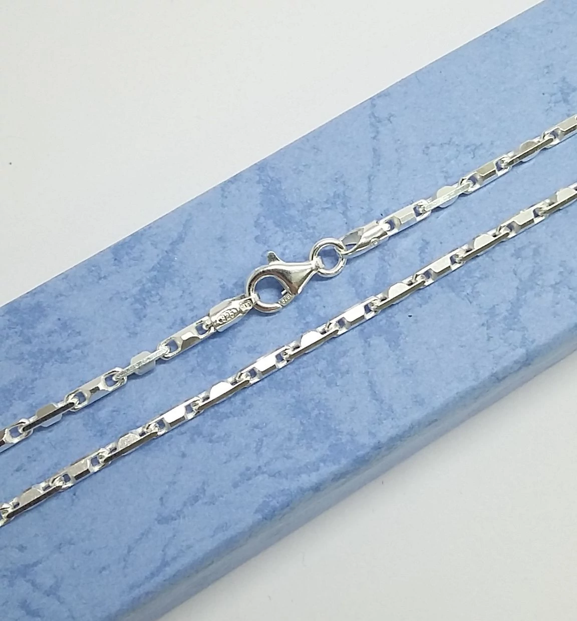 Unisex,azaz nőnek és férfinak egyaránt jó ezüst lánc. Különleges pálcikás kötéssel.55 cm hosszú ez a vastagabb fazon. Minőségi kidolgozás.Magyar fémjelzéssel ellátva.925-ös sterling ezüst. |