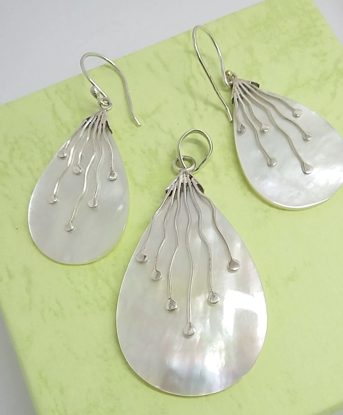 Gyönyörűen kidolgozott ezüst medál és fülbevaló szett gyöngyházból. Csepp forma,indás mintával.A fülbevaló beakasztós,csüngős. Minőségi kidolgozás.Magyar fémjelzéssel ellátva. 925-ös sterling ezüst.
