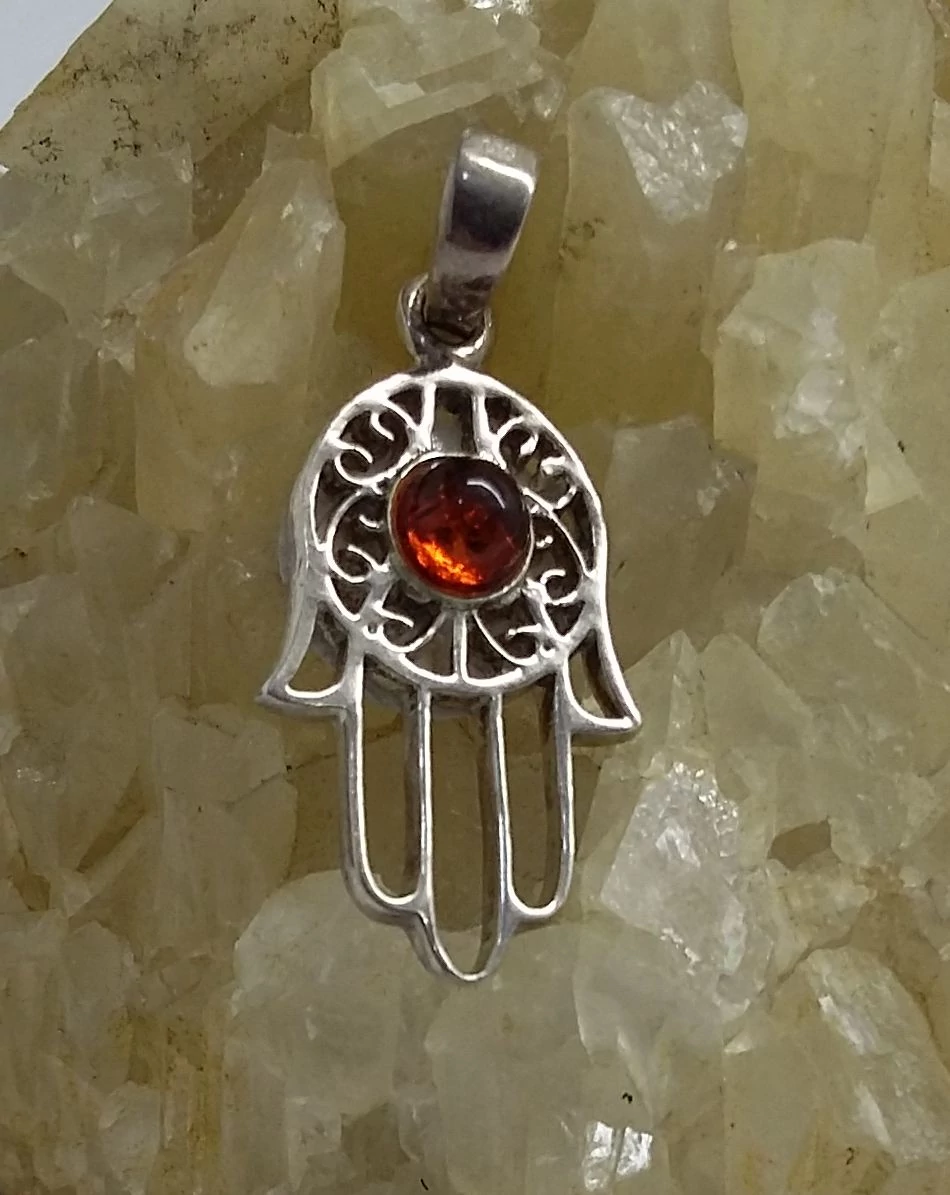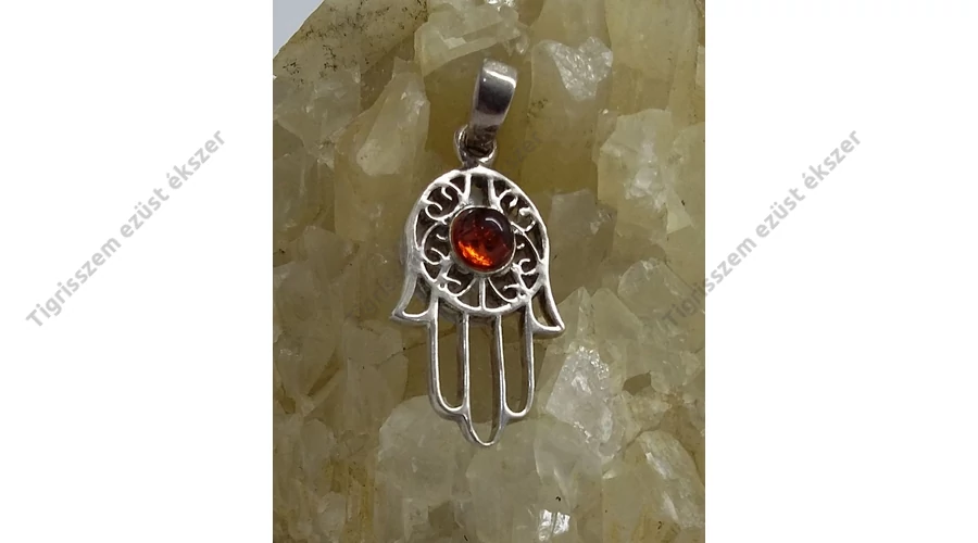 Gyönyörűen kidolgozott ezüst medál"Fatime keze" borostyánnal. Minőségi kidolgozás! Magyar fémjel,925-ös sterling ezüst. |