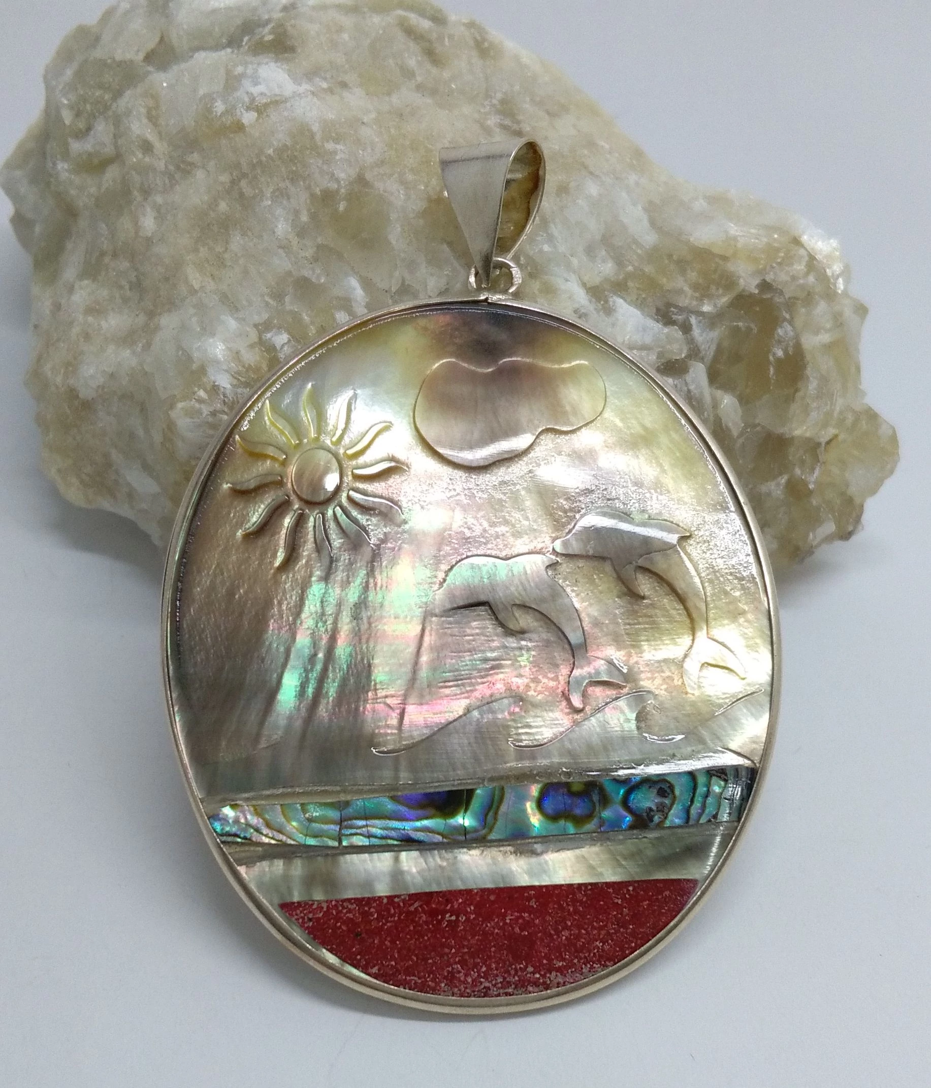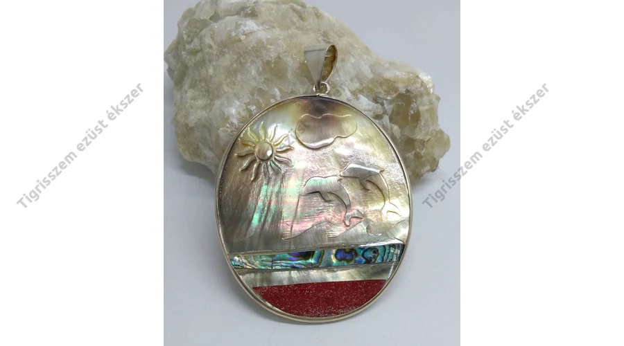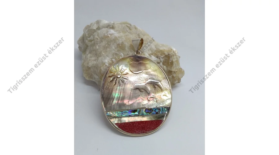 Nagy méretű gyöngyház ezüst medál páva kagyló és korall berakással,ovális forma.Domborodó minták. Minőségi kidolgozás. Magyar fémjelzéssel ellátva.925-ös sterling ezüst |