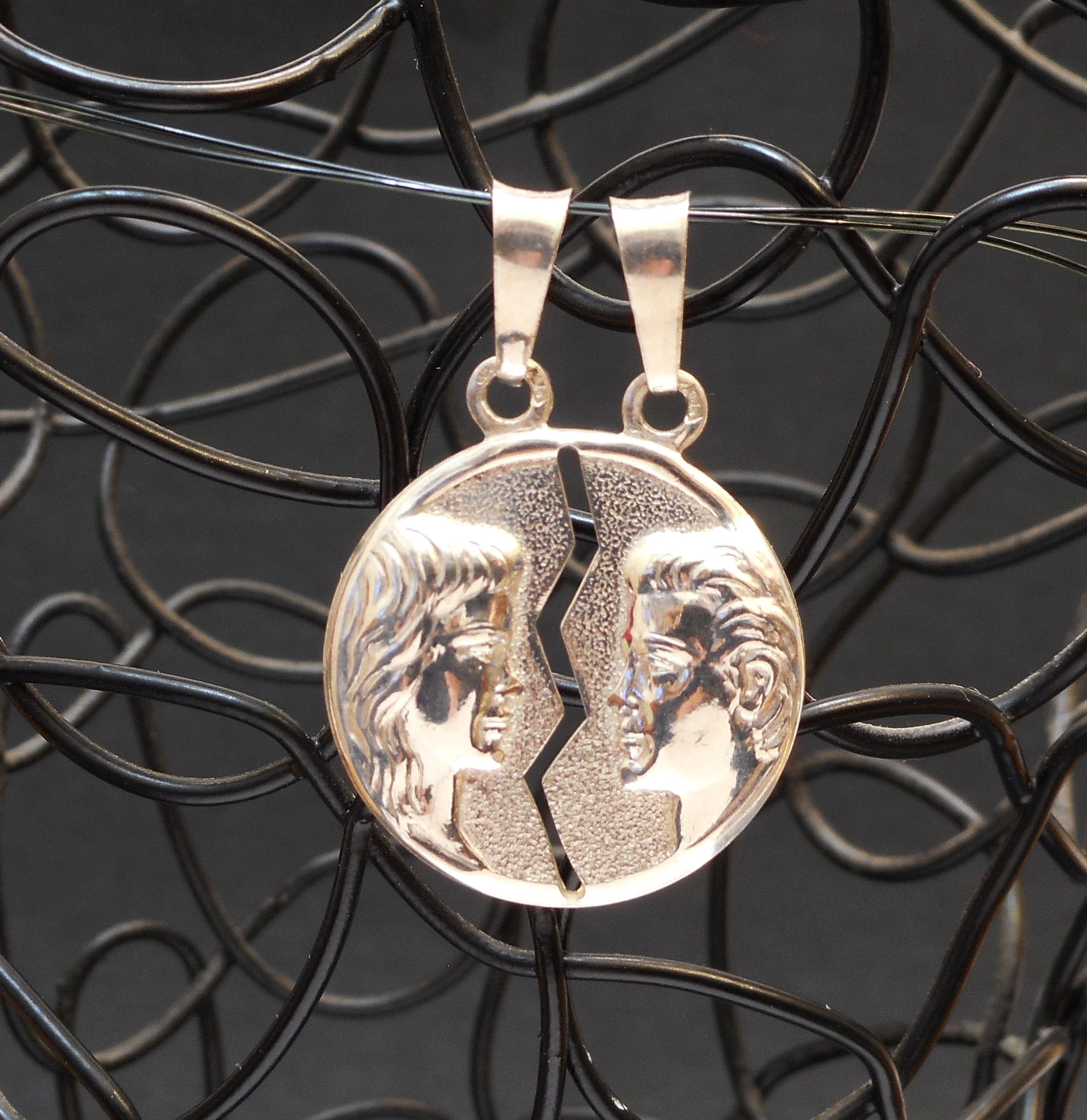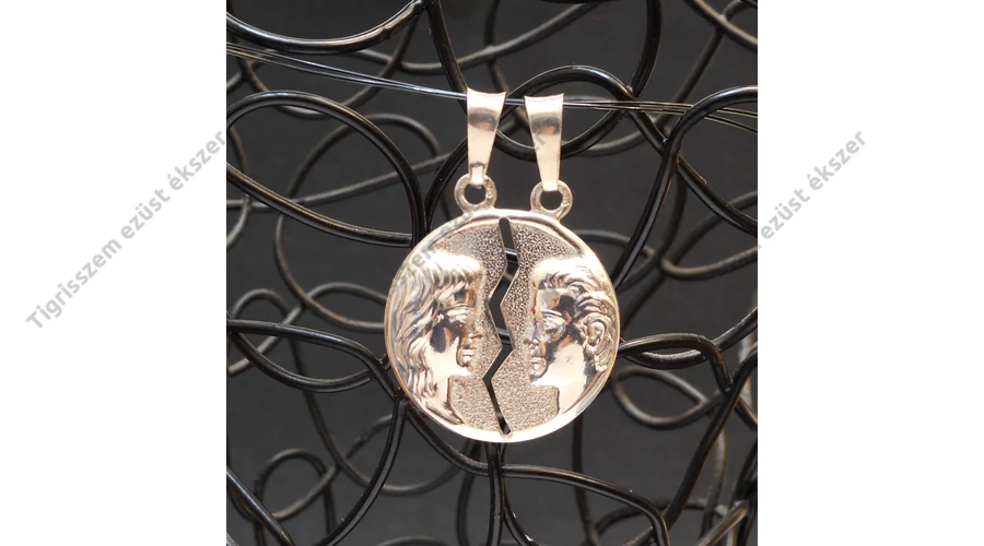 | Gyönyörűen kidolgozott kör alakú lapon domború (női és férfi fej) medál.Kettétörhető Minőségi kidolgozás. 925-ös finomság. Magyar fémjellel ellátva. | |