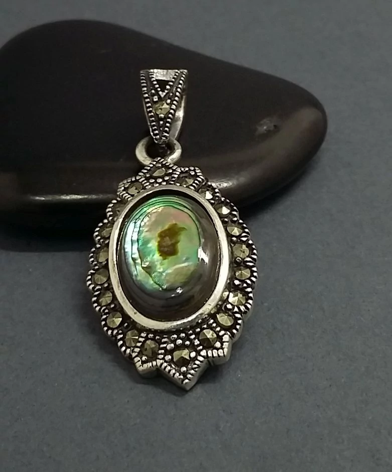 Nagyon szép ezüst medál páva kagylóval és markazittal.Antikolt.