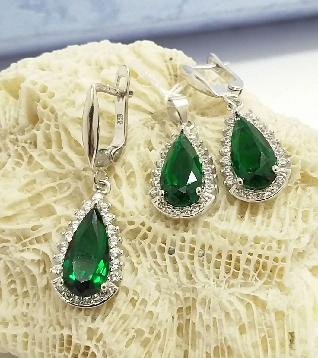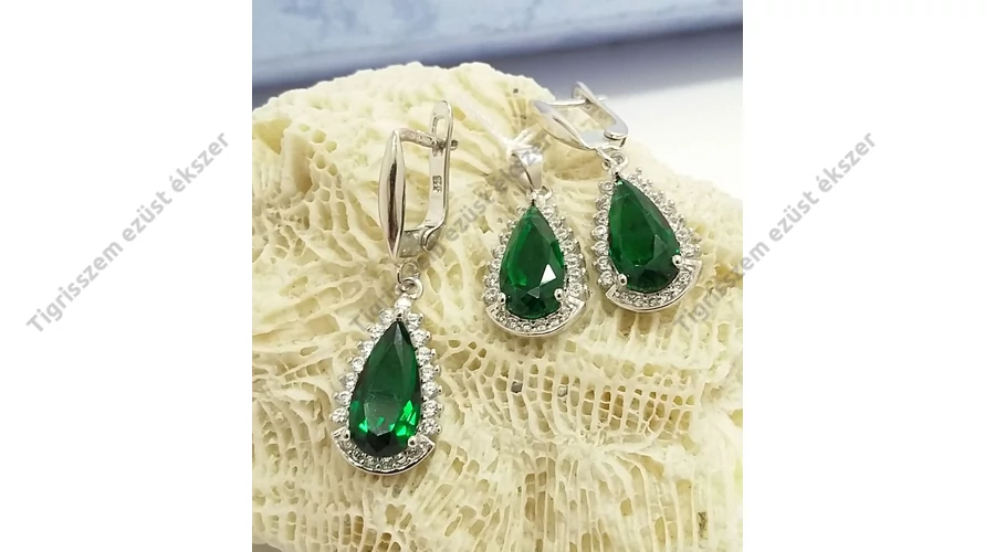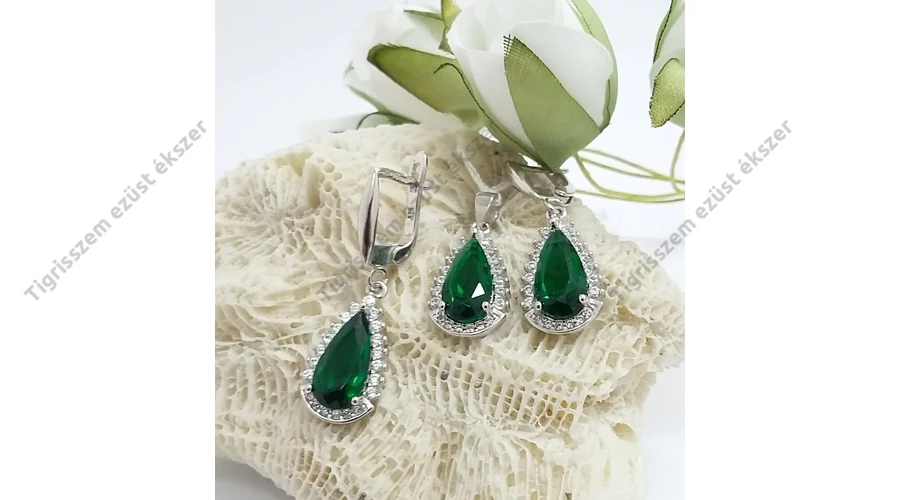 Gyönyörű ezüst medál és fülbevaló szett.Fehér és zöld színű cirkónia kővel.Csüngős francia kapcsos. 925-ös sterling ezüst Magyar fémjel. |