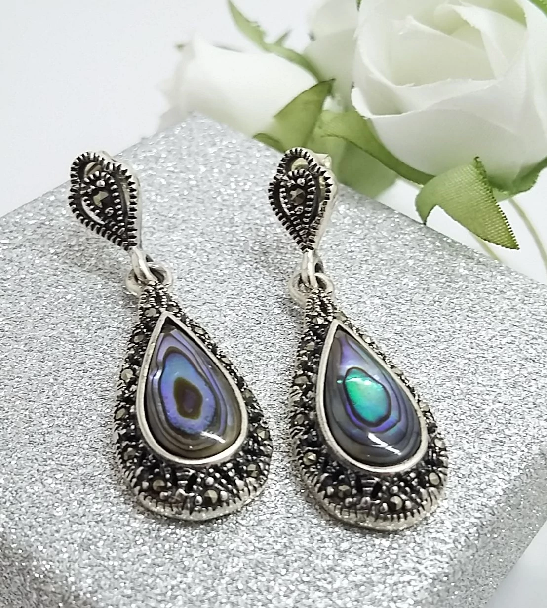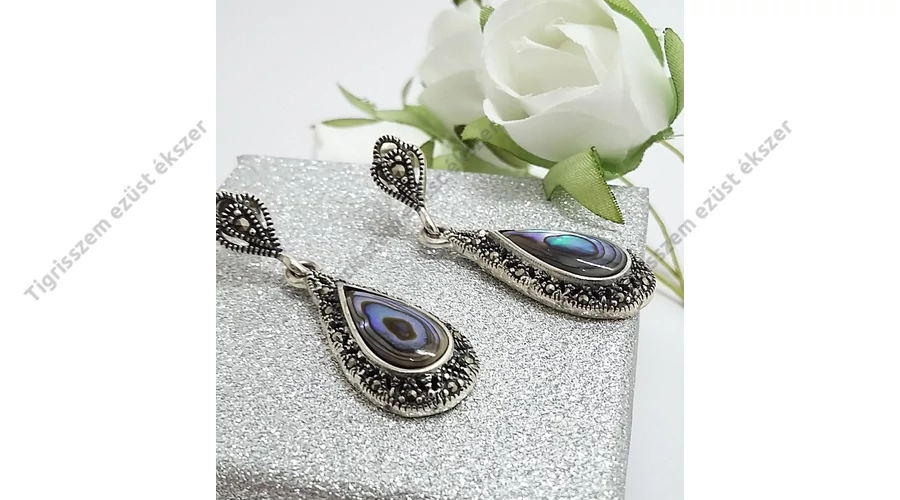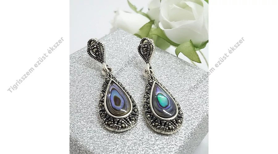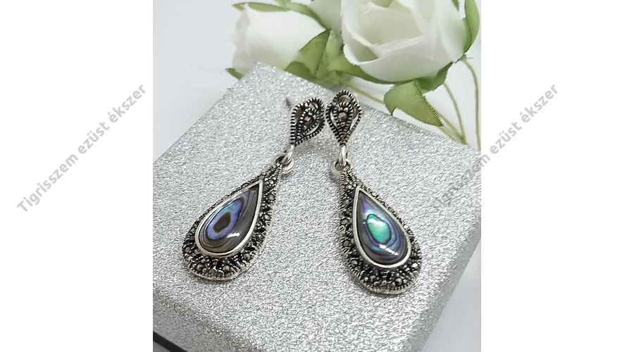 Gyönyörű ezüst csüngős fülbevaló pávakagylóval+markazit kővel.Stekkeres. 925-ös sterling ezüst Magyar fémjel. |