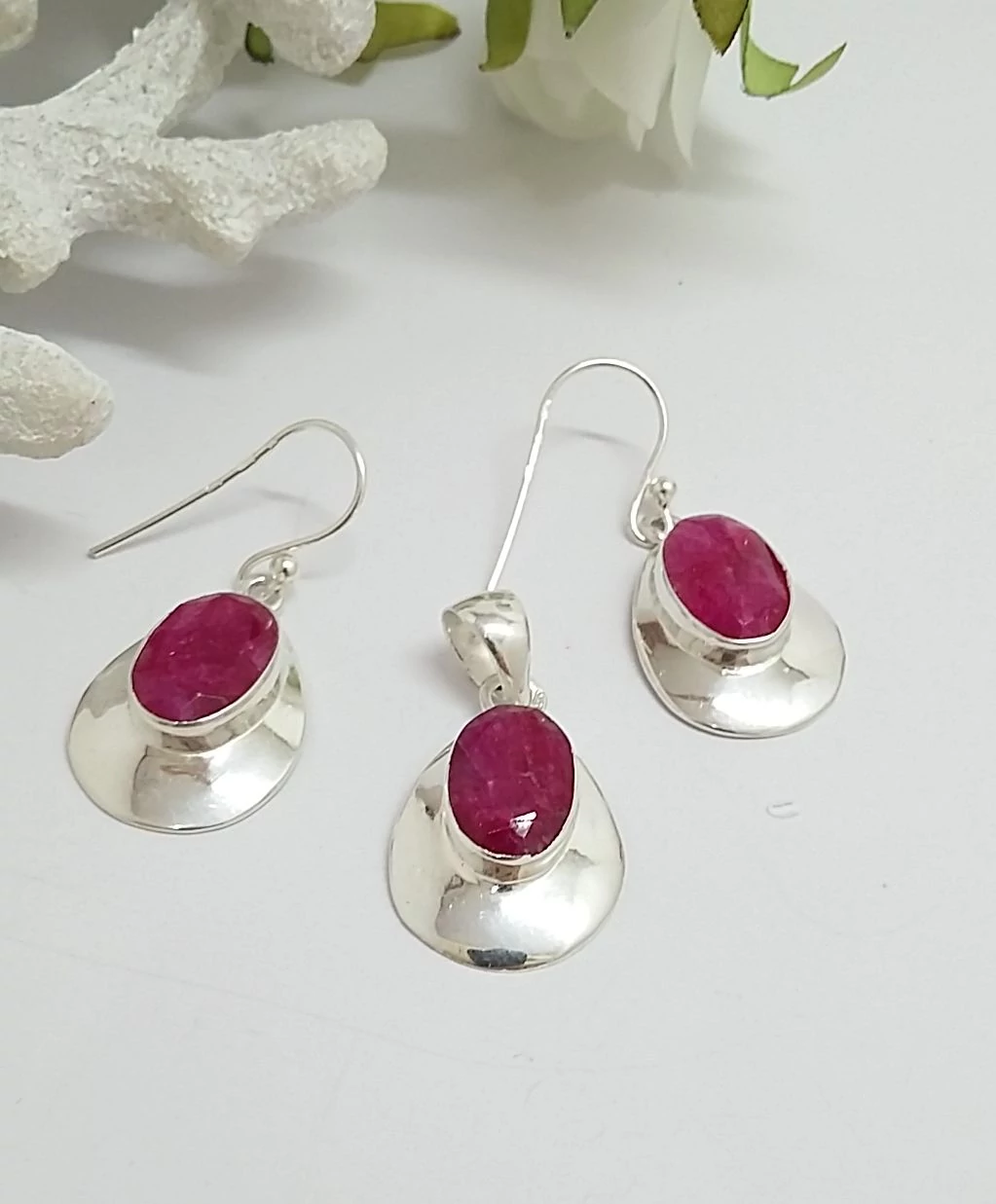Gyönyörű ezüst fülbevaló+medál szett fazettált,valódi RUBIN kővel. Beakasztós. 925-ös sterling ezüst Magyar fémjel. |