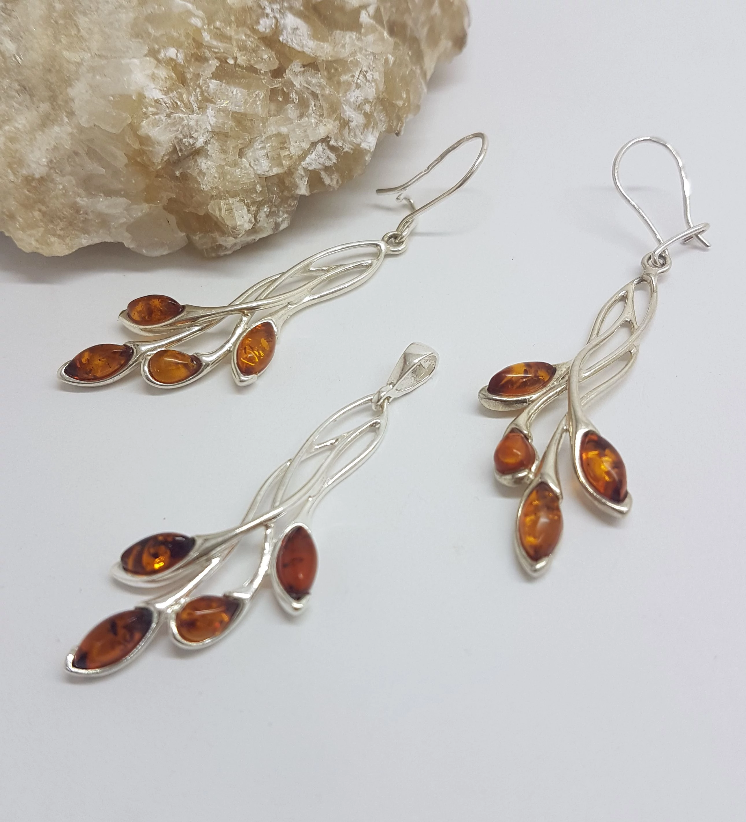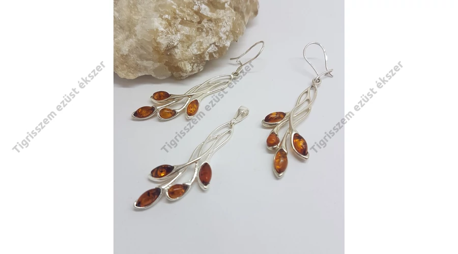 Nagyon különleges ezüst szett,fülbevaló és medál balti BOROSTYÁNNAL, kézzel készült,egyedifazon.Exkluzív és extravagáns darab! Csüngős 4 db zabszem forma kővel készült.Minőségi kidolgozás. 925-ös sterling ezüst ,magyar fémjel |