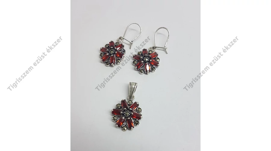 Gyönyörű ezüst szett,medál és fülbevaló valódi CSEH GRÁNÁT kővel és kicsi markazitokkal. Beakasztós csüngős fülbevaló. Minőségi kidolgozás.Magyar fémjel.925-ös sterling ezüst |