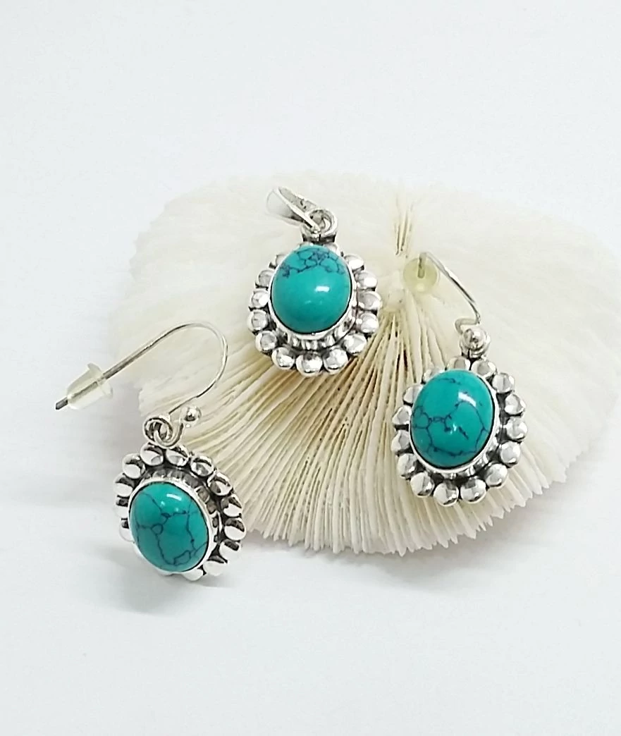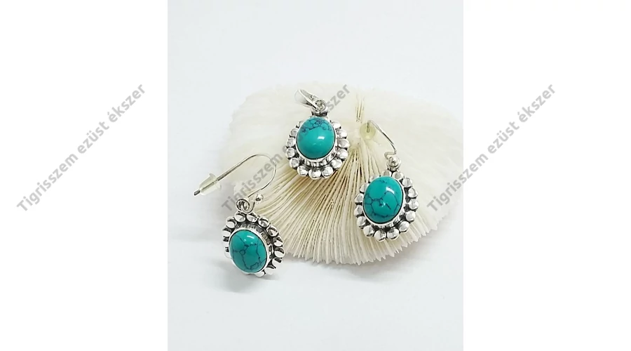 Gyönyörű ezüst fülbevaló és medál szett türkiz kővel.Ovális kő,virág forma. Beakasztós,csüngős fazon. 925-ös sterling ezüst Magyar fémjel. |