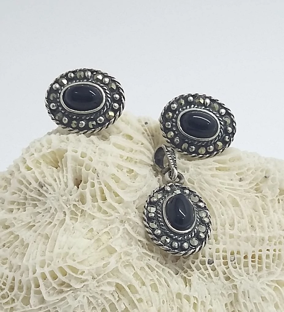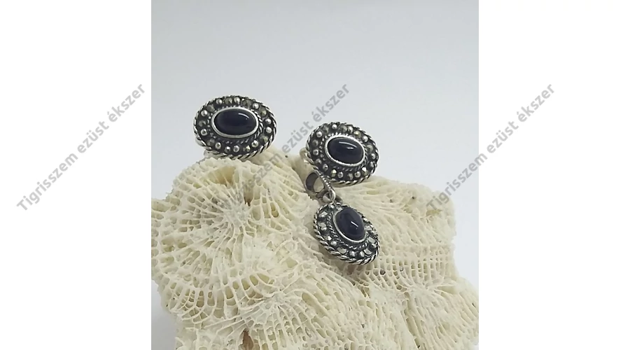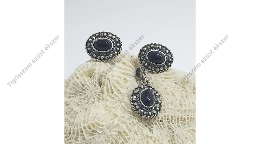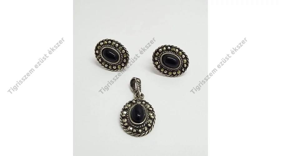 Gyönyörűen kidolgozott ezüst fülbevaló és medál szett középen egy kaboson csiszolású ovális forma onix kővel.Körülötte apró markazit kövekkel díszítve,antikolt.Ez a fazon a kisebb méret. A fülbevaló francia kapcsos. 925-ös finomság. Magyar fémjellel ellátva.