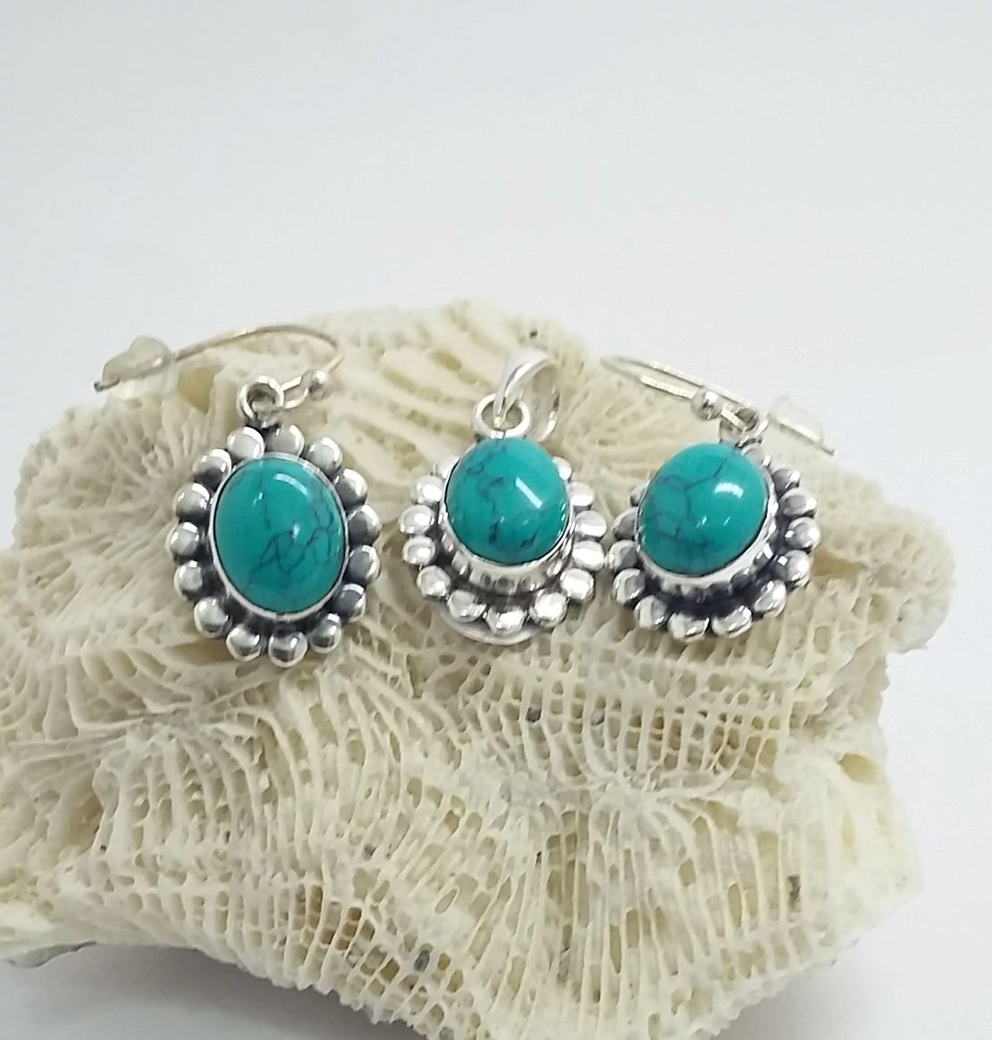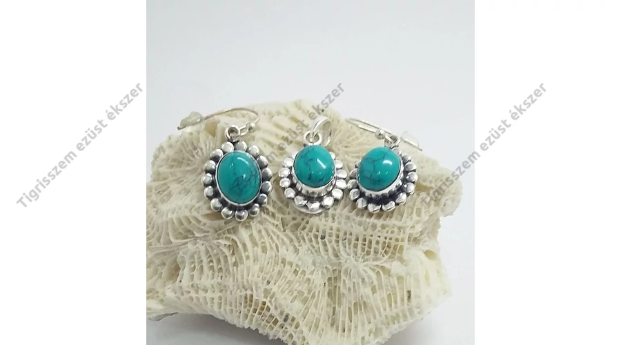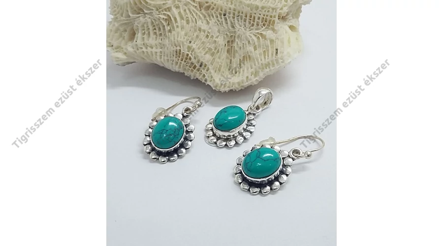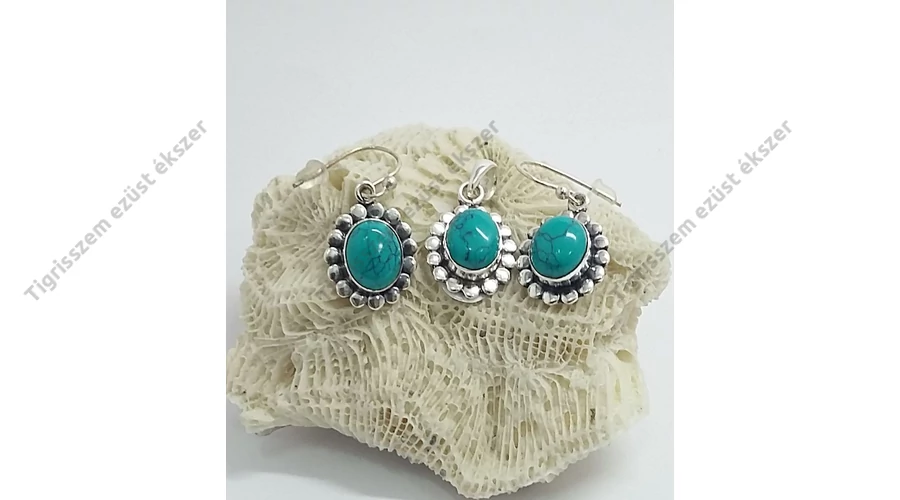 Gyönyörűen kidolgozott,különleges ezüst szett valódi VALÓDI TÜRKIZ kővel.Beakasztós,csüngős fazon. A türkiz kő kaboson csiszolás és ovális forma. Minőségi kidolgozás. Magyar fémjel.925-ös sterling ezüst. |