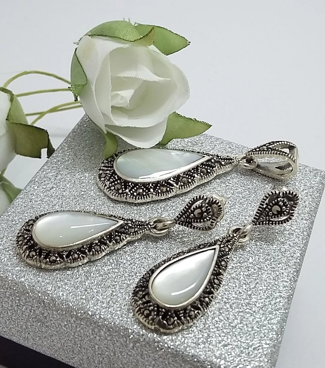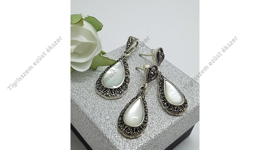 Gyönyörű ezüst fülbevaló+medál szett gyöngyházzal és markazit kővel. Stekkeres,csüngős a fülbevaló. 925-ös sterling ezüst Magyar fémjel. |