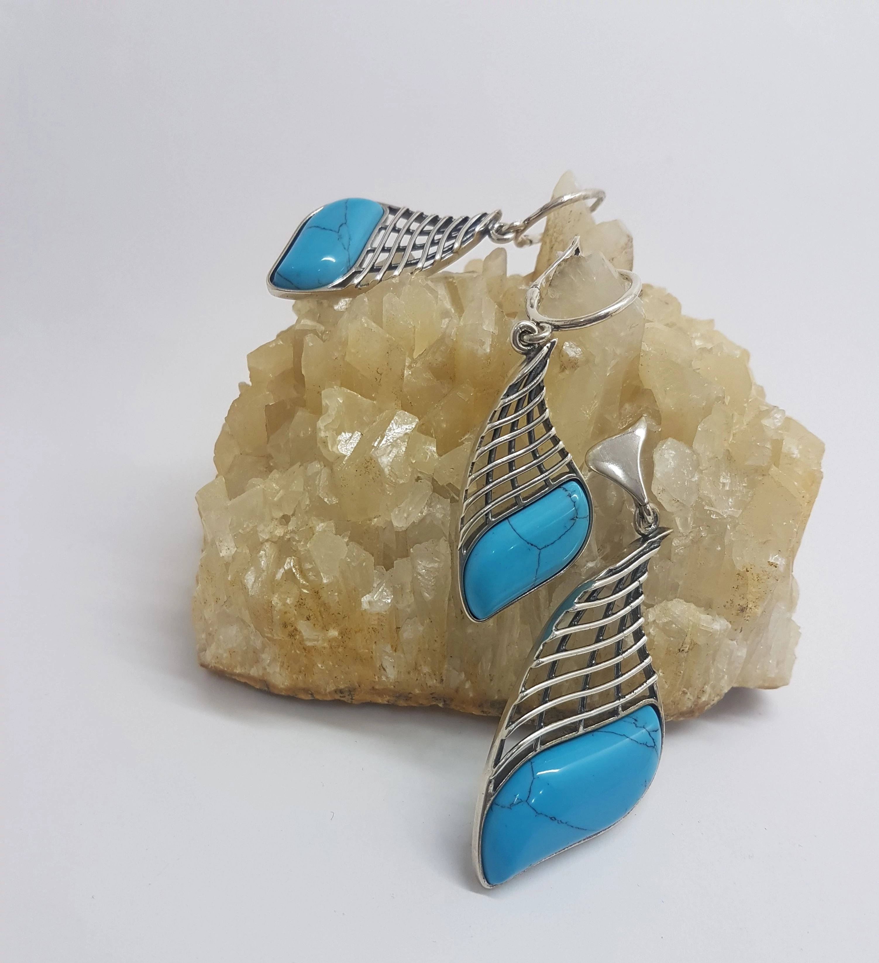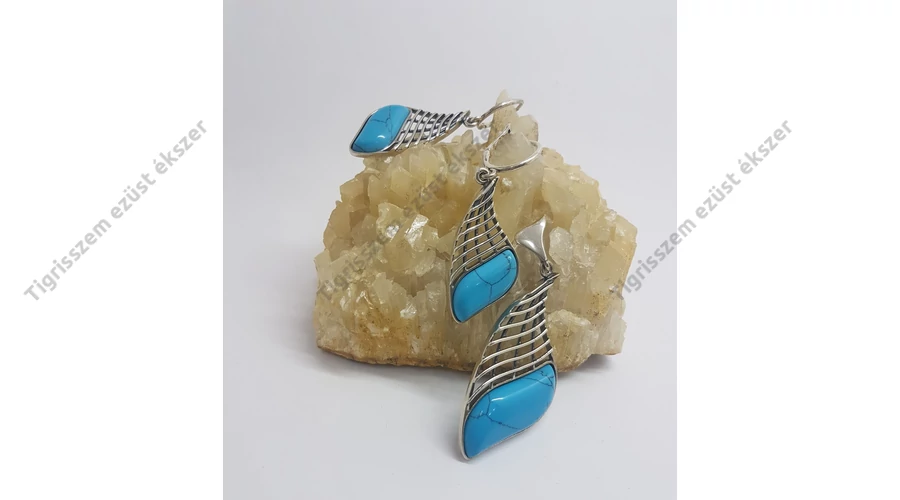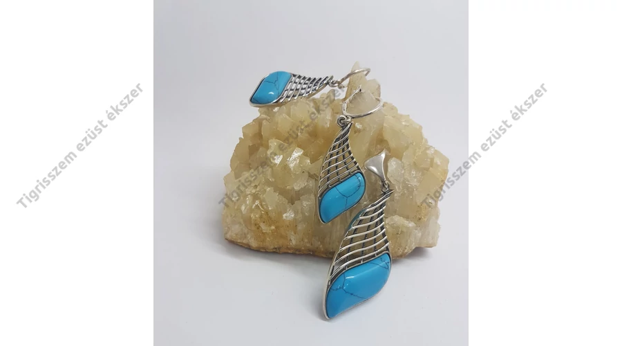 Gyönyörűen kidolgozott ezüst medál+fülbevaló szett türkiz kővel.Kissé antikolt. A fülbevaló francia kapcsos csüngős. Minőségi kidolgozás. Magyar fémjel. 925-ös sterling ezüst |