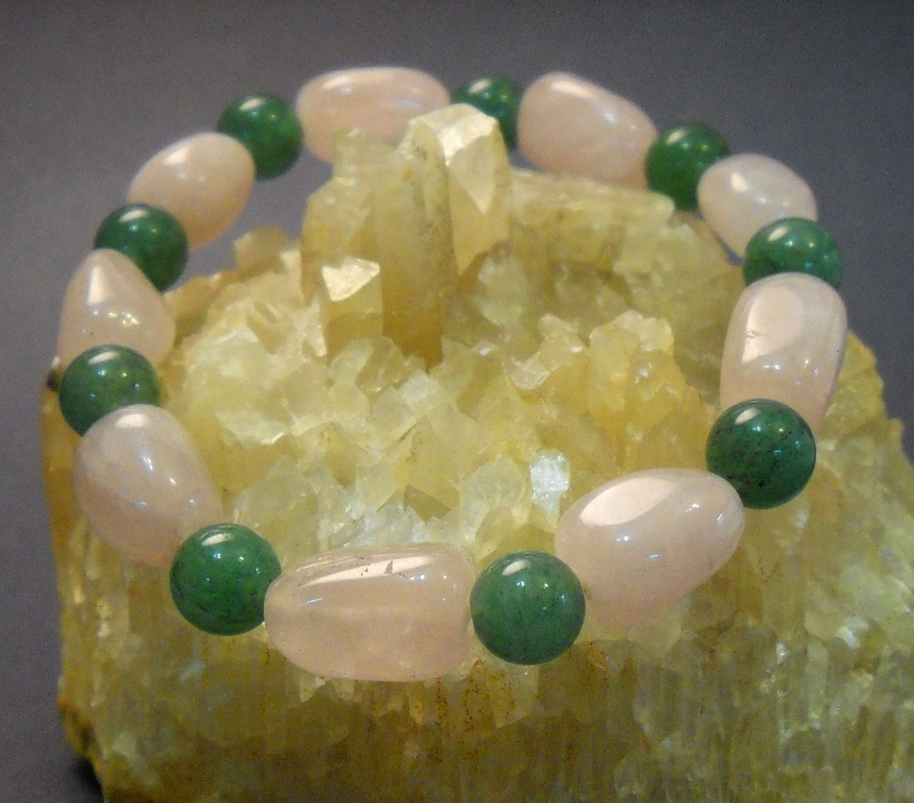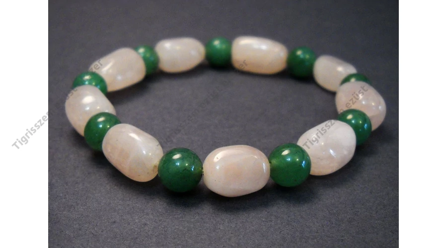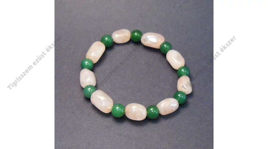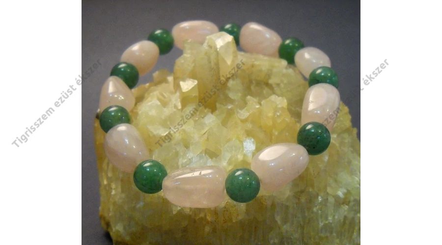 Gyönyörűen csiszolt rózsakvarc(szögletes 13x6x6 mm-es ) és aventurin(8 mm-es kerek) szemekből állítottuk össze ezt a karkötőt.Mindkét ásvány a szív csakrát erősíti. Szeretet szerelem megbocsájtás,elengedés.A depresszió,félelem legyőzése az önbizalom erősítése.Az öröm,boldogság érzés erősítése. 19 cm( más méret is kérhető) |