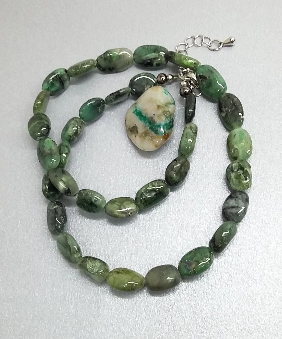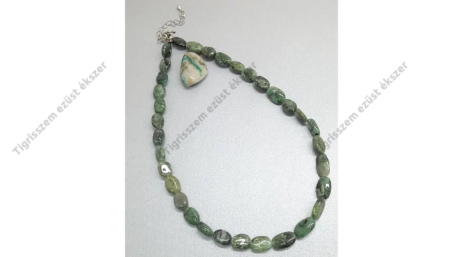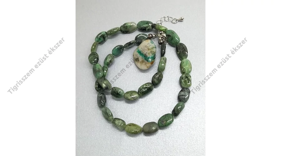 Gyönyörű smaragd lánc,nemesacél zárszerkezettel.43 cm hosszú. 4-6 mm és 8-10 mm -es lapos szemek. |