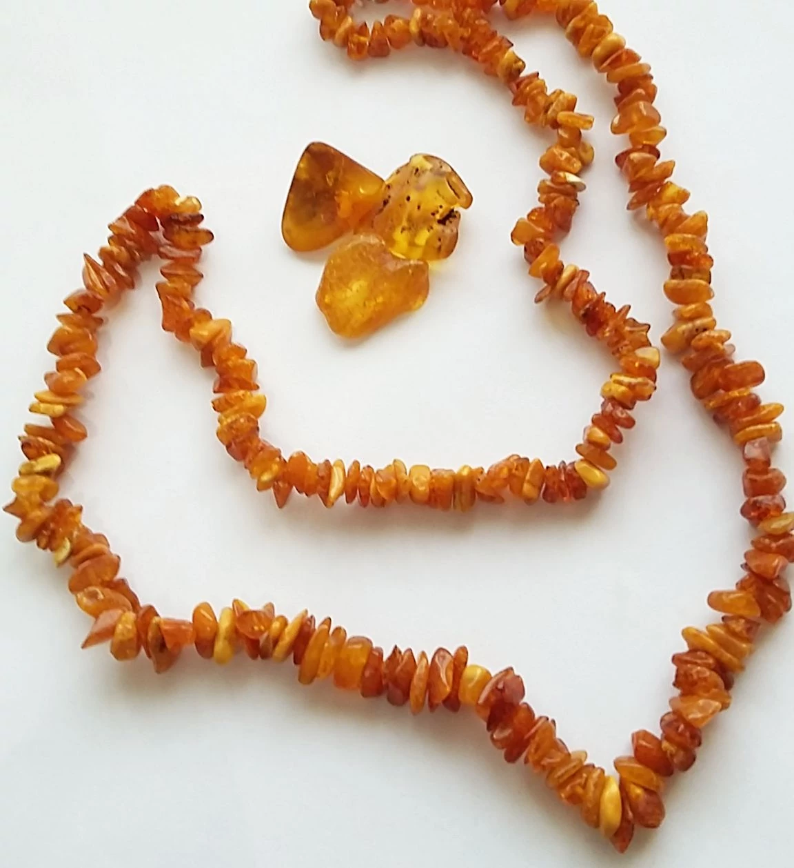 Különböző méretű és árnyalatban eltérő szemekből fűzött balti borostyán lánc.